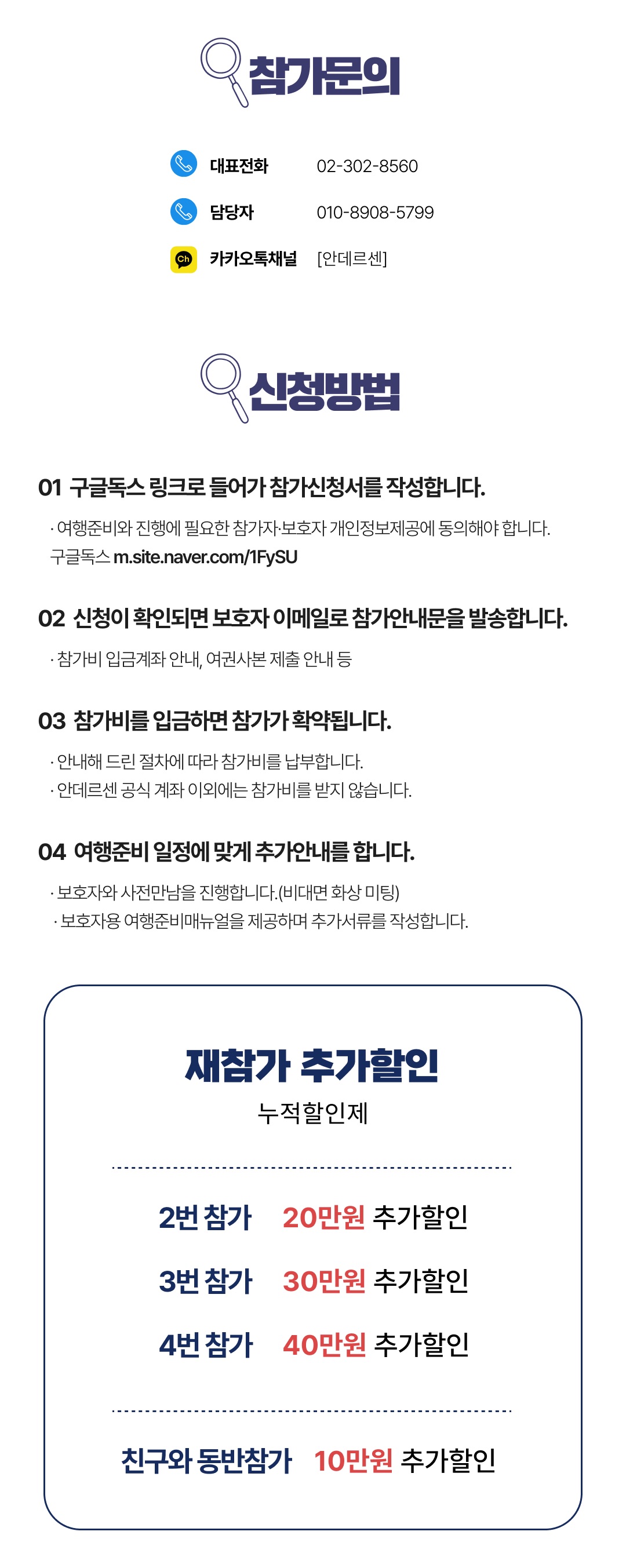 상세한 여행준비를 위해 구글 참가신청서를 작성해주셔야 합니다. 구글독스 참가신청서를 작성하지 않으면 정상적으로 예약이 접수되지 않습니다. 클릭하면 바로 구글 참가신청서로 연결됩니다.