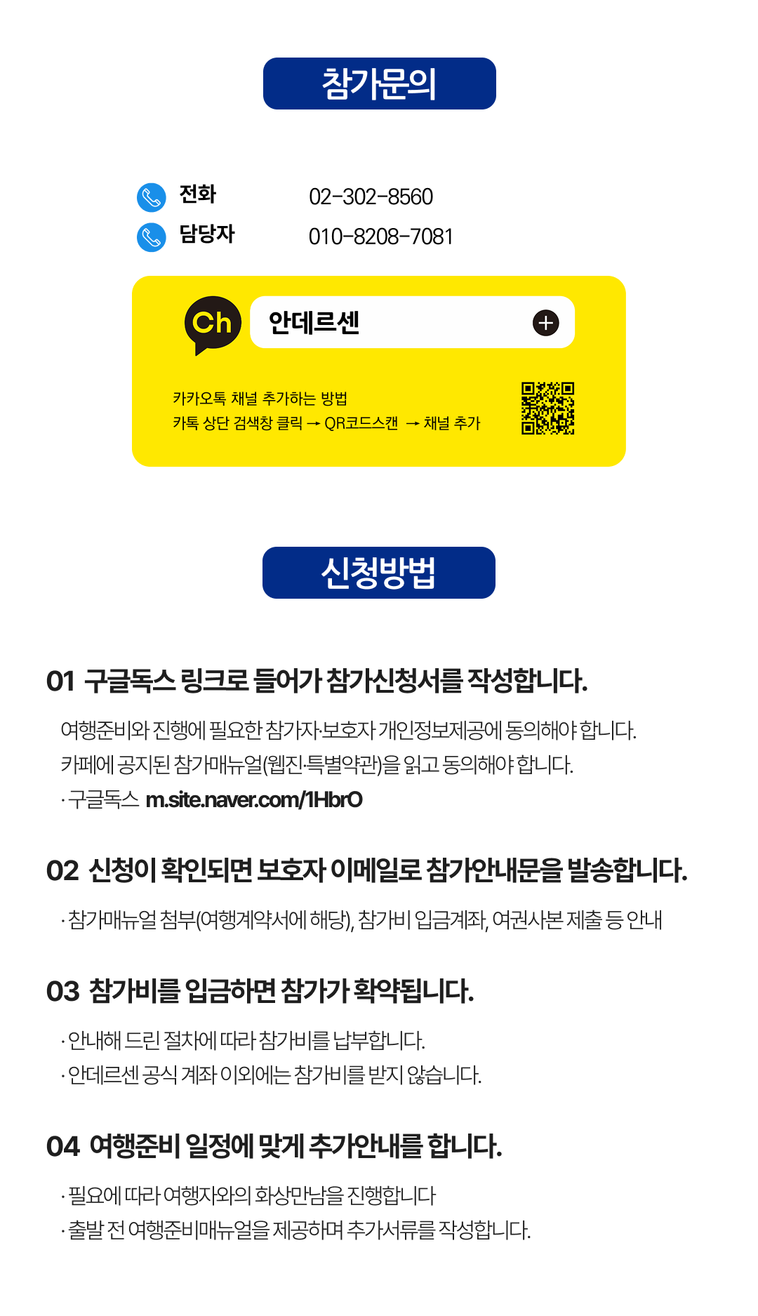 상세한 여행준비를 위해 구글 참가신청서를 작성해주셔야 합니다. 구글독스 참가신청서를 작성하지 않으면 정상적으로 예약이 접수되지 않습니다. 클릭하면 바로 구글 참가신청서로 연결됩니다.
