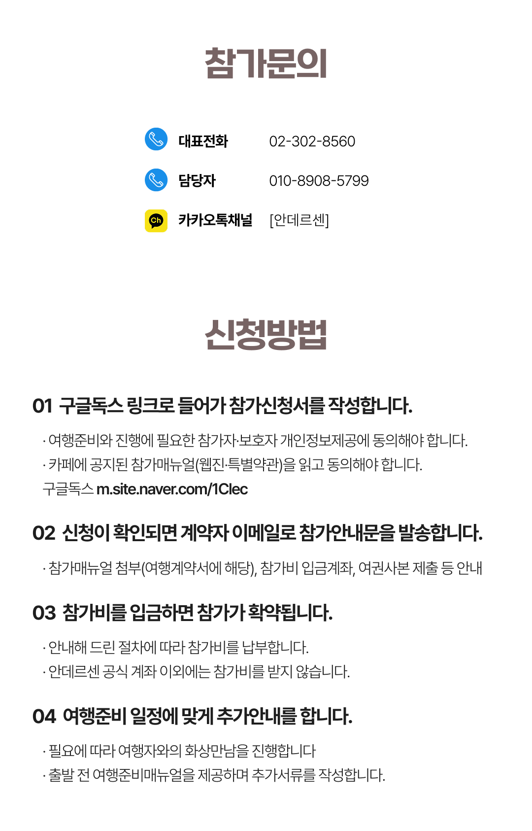 상세한 여행준비를 위해 구글 참가신청서를 작성해주셔야 합니다. 구글독스 참가신청서를 작성하지 않으면 정상적으로 예약이 접수되지 않습니다. 클릭하면 바로 구글 참가신청서로 연결됩니다.