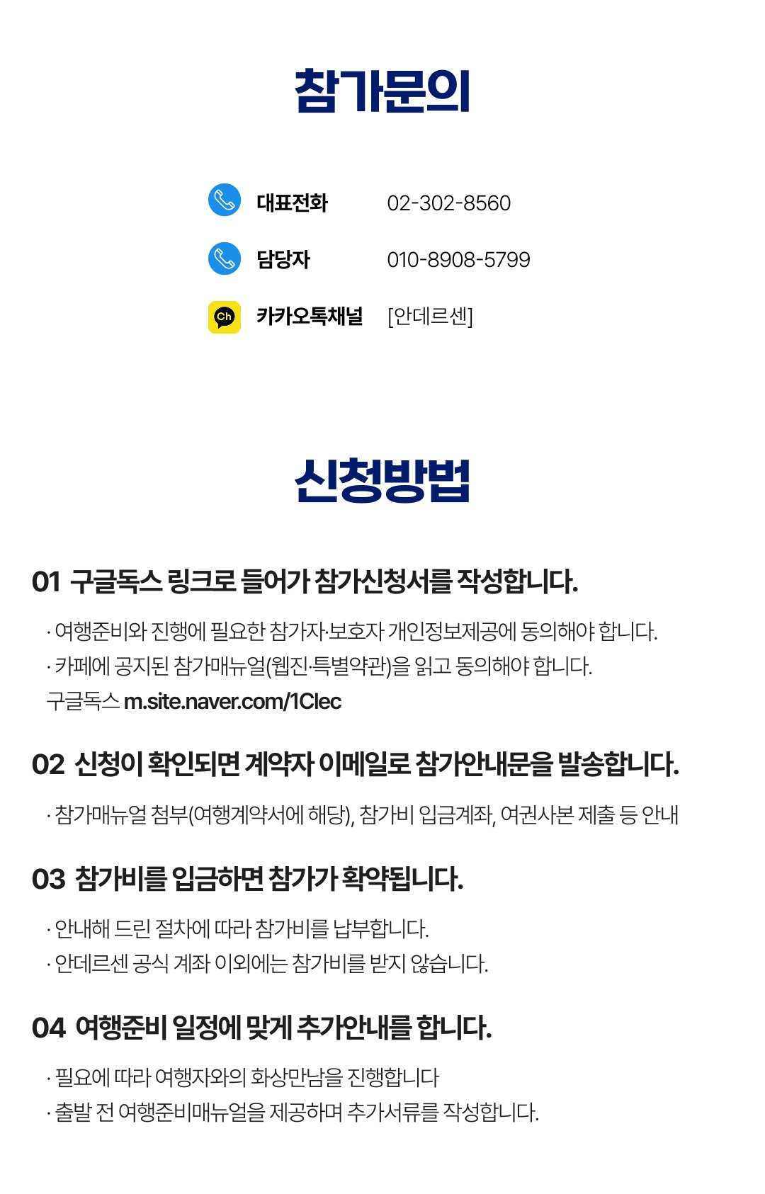 상세한 여행준비를 위해 구글 참가신청서를 작성해주셔야 합니다. 구글독스 참가신청서를 작성하지 않으면 정상적으로 예약이 접수되지 않습니다. 클릭하면 바로 구글 참가신청서로 연결됩니다.