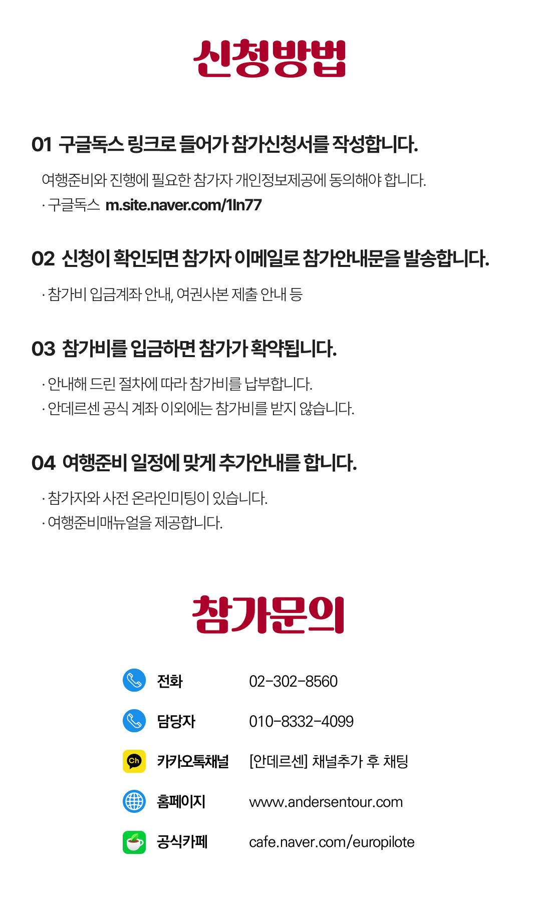 상세한 여행준비를 위해 구글 참가신청서를 작성해주셔야 합니다. 구글독스 참가신청서를 작성하지 않으면 정상적으로 예약이 접수되지 않습니다. 클릭하면 바로 구글 참가신청서로 연결됩니다.