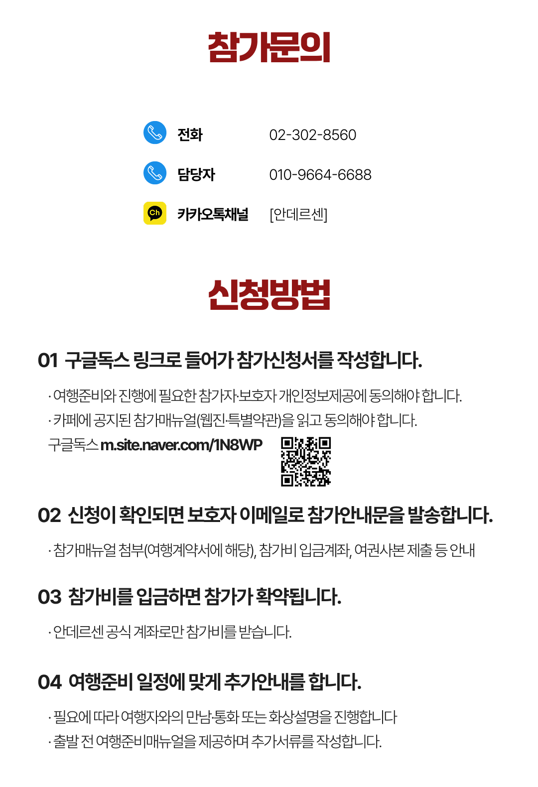 상세한 여행준비를 위해 구글 참가신청서를 작성해주셔야 합니다. 구글독스 참가신청서를 작성하지 않으면 정상적으로 예약이 접수되지 않습니다. 클릭하면 바로 구글 참가신청서로 연결됩니다.