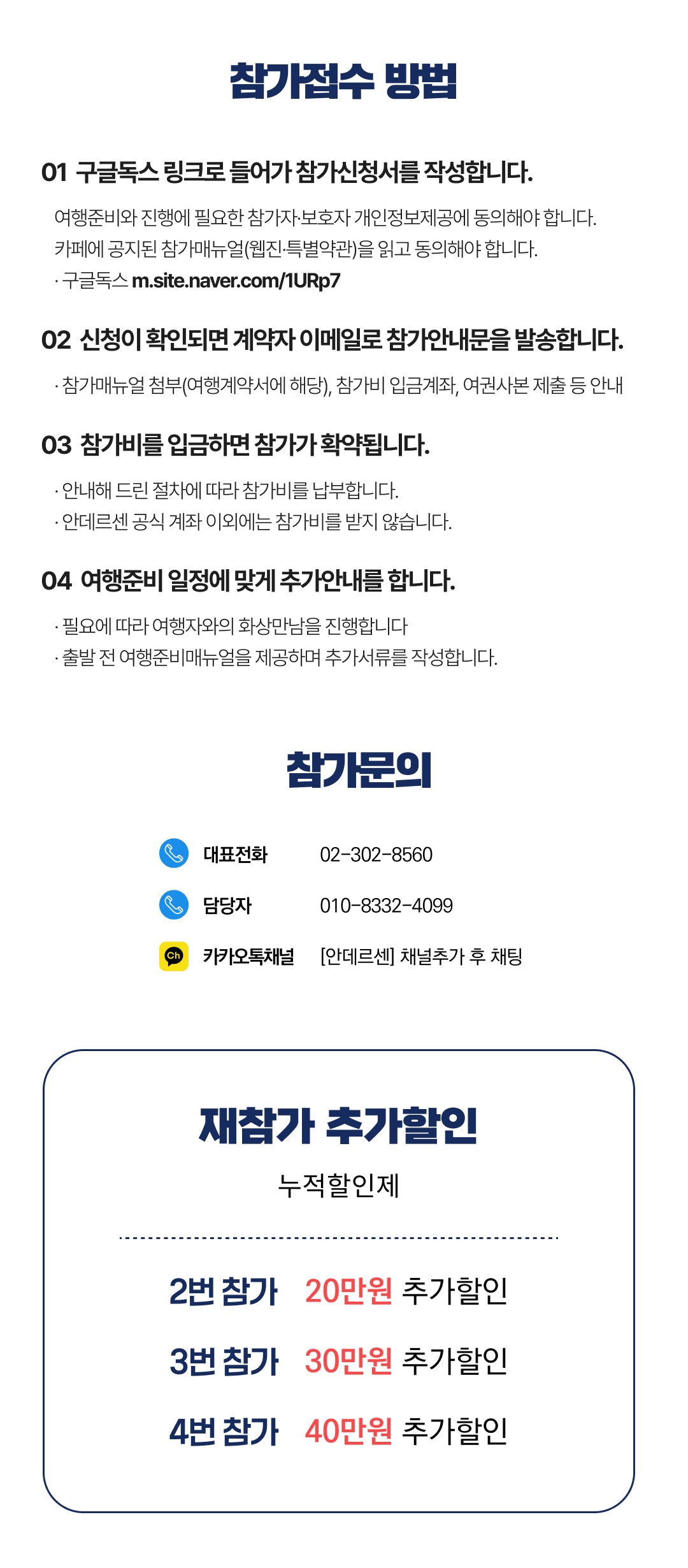 상세한 여행준비를 위해 구글 참가신청서를 작성해주셔야 합니다. 구글독스 참가신청서를 작성하지 않으면 정상적으로 예약이 접수되지 않습니다. 클릭하면 바로 구글 참가신청서로 연결됩니다.