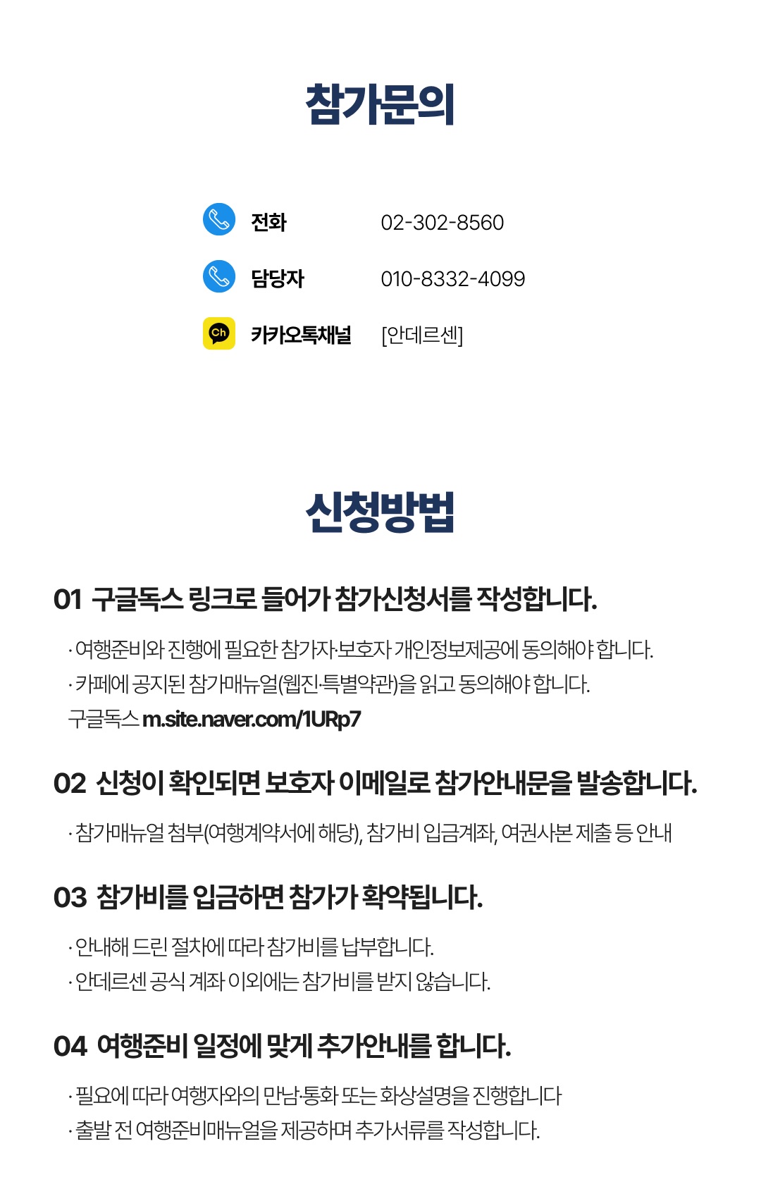 상세한 여행준비를 위해 구글 참가신청서를 작성해주셔야 합니다. 구글독스 참가신청서를 작성하지 않으면 정상적으로 예약이 접수되지 않습니다. 클릭하면 바로 구글 참가신청서로 연결됩니다.