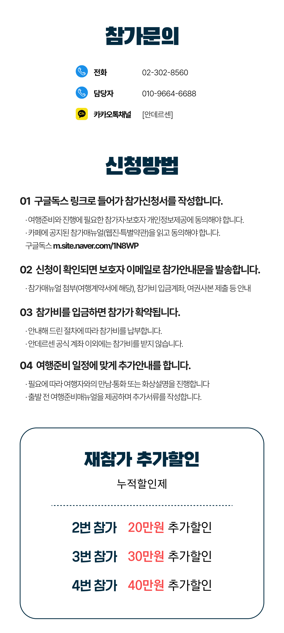 상세한 여행준비를 위해 구글 참가신청서를 작성해주셔야 합니다. 구글독스 참가신청서를 작성하지 않으면 정상적으로 예약이 접수되지 않습니다. 클릭하면 바로 구글 참가신청서로 연결됩니다.
