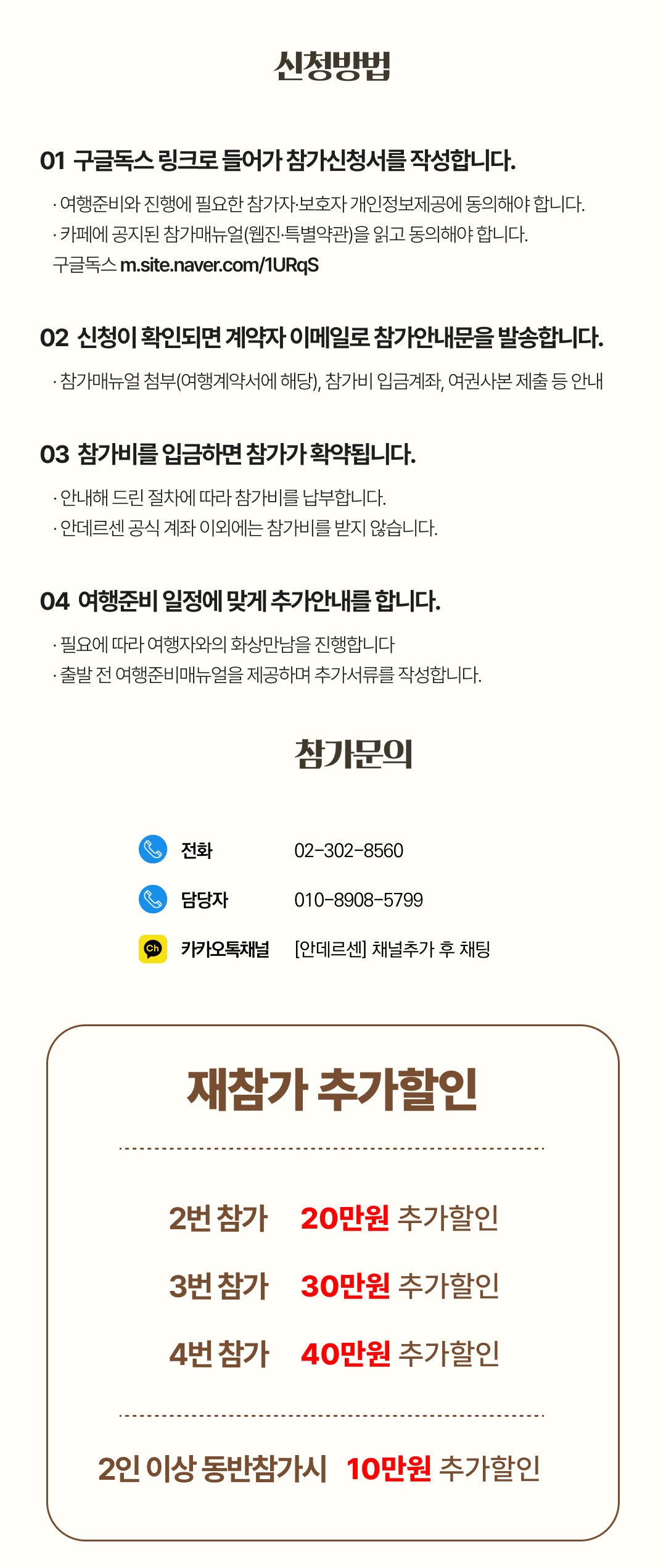 상세한 여행준비를 위해 구글 참가신청서를 작성해주셔야 합니다. 구글독스 참가신청서를 작성하지 않으면 정상적으로 예약이 접수되지 않습니다. 클릭하면 바로 구글 참가신청서로 연결됩니다.