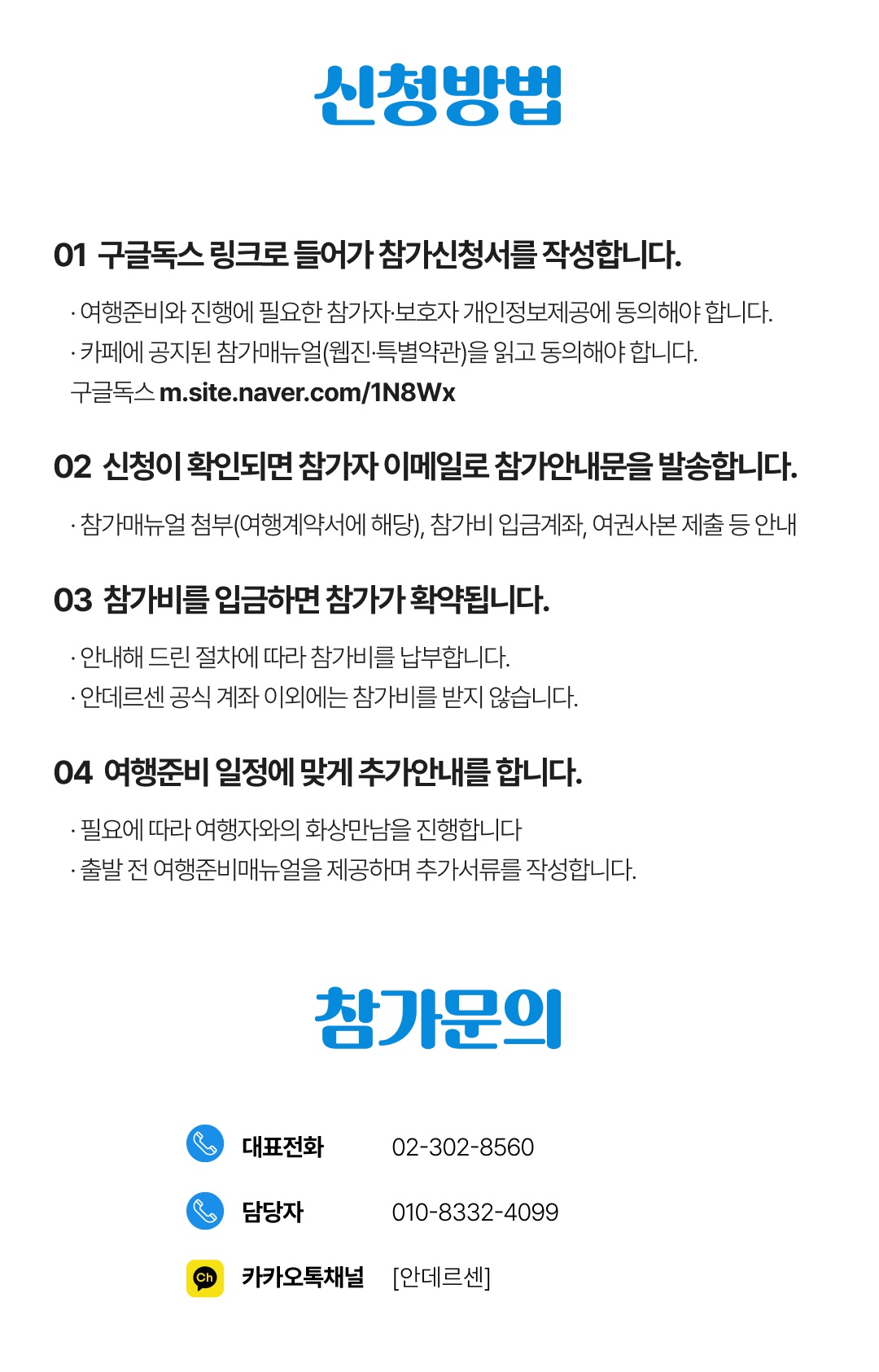 상세한 여행준비를 위해 구글 참가신청서를 작성해주셔야 합니다. 구글독스 참가신청서를 작성하지 않으면 정상적으로 예약이 접수되지 않습니다. 클릭하면 바로 구글 참가신청서로 연결됩니다.