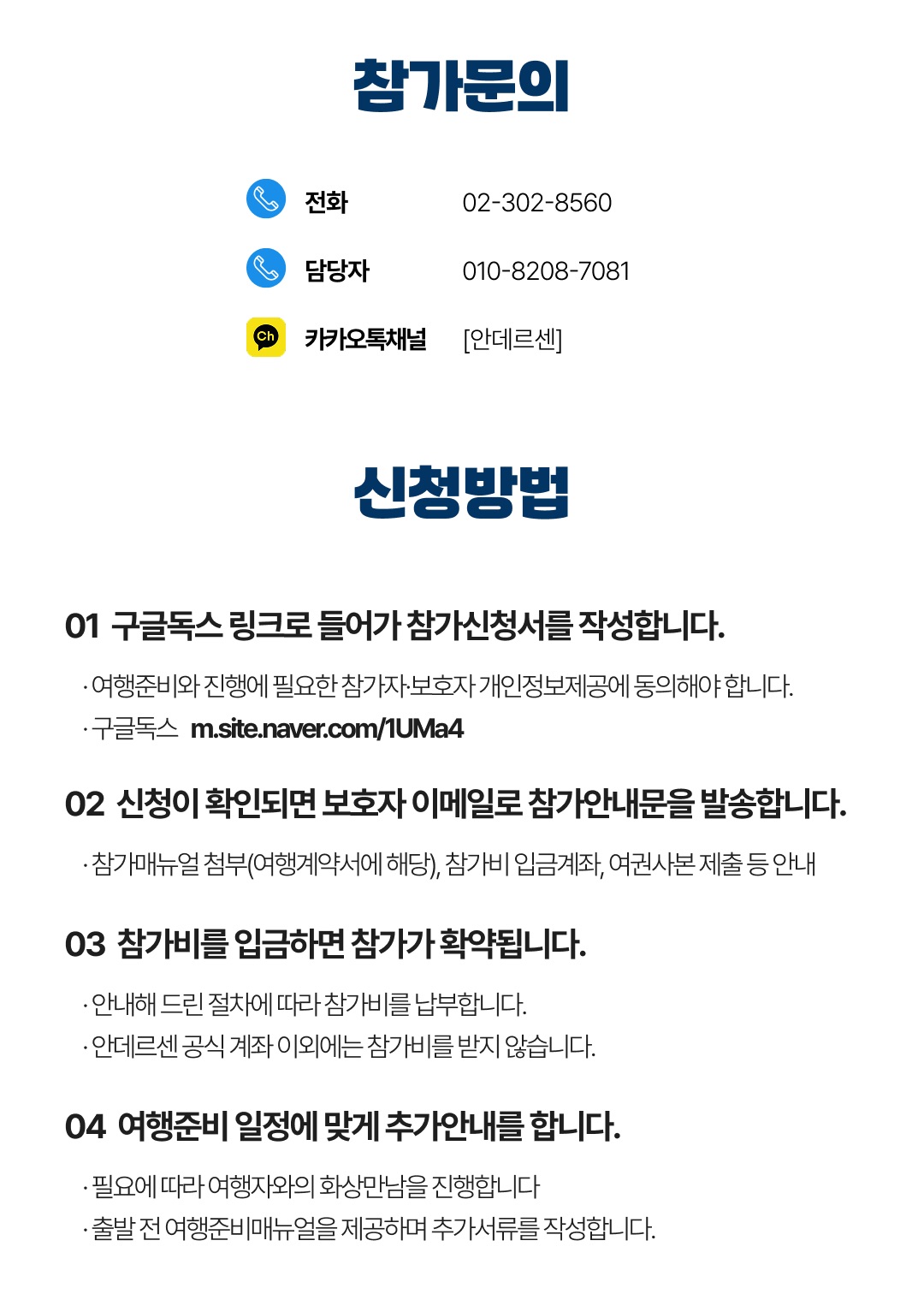 상세한 여행준비를 위해 구글 참가신청서를 작성해주셔야 합니다. 구글독스 참가신청서를 작성하지 않으면 정상적으로 예약이 접수되지 않습니다. 클릭하면 바로 구글 참가신청서로 연결됩니다.