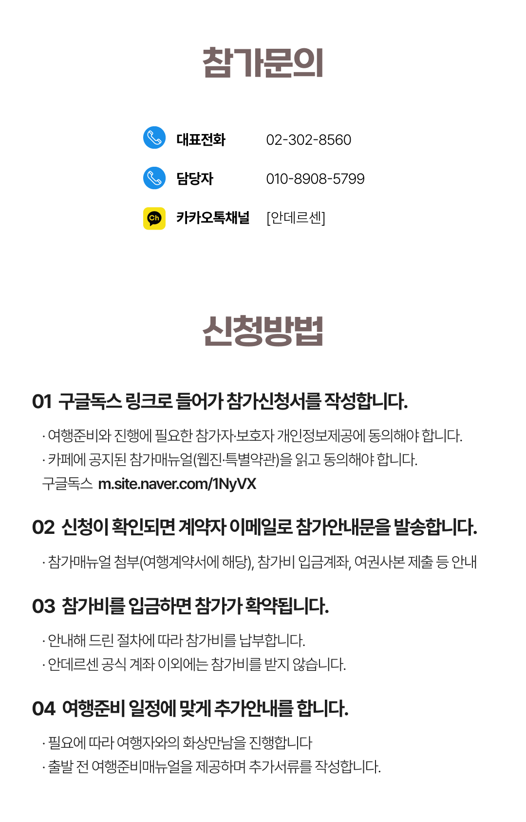 상세한 여행준비를 위해 구글 참가신청서를 작성해주셔야 합니다. 구글독스 참가신청서를 작성하지 않으면 정상적으로 예약이 접수되지 않습니다. 클릭하면 바로 구글 참가신청서로 연결됩니다.