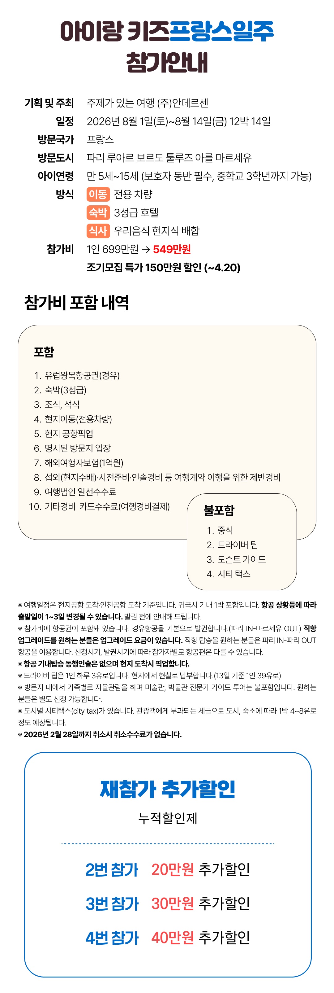 상세한 여행준비를 위해 구글 참가신청서를 작성해주셔야 합니다. 구글독스 참가신청서를 작성하지 않으면 정상적으로 예약이 접수되지 않습니다. 클릭하면 바로 구글 참가신청서로 연결됩니다.