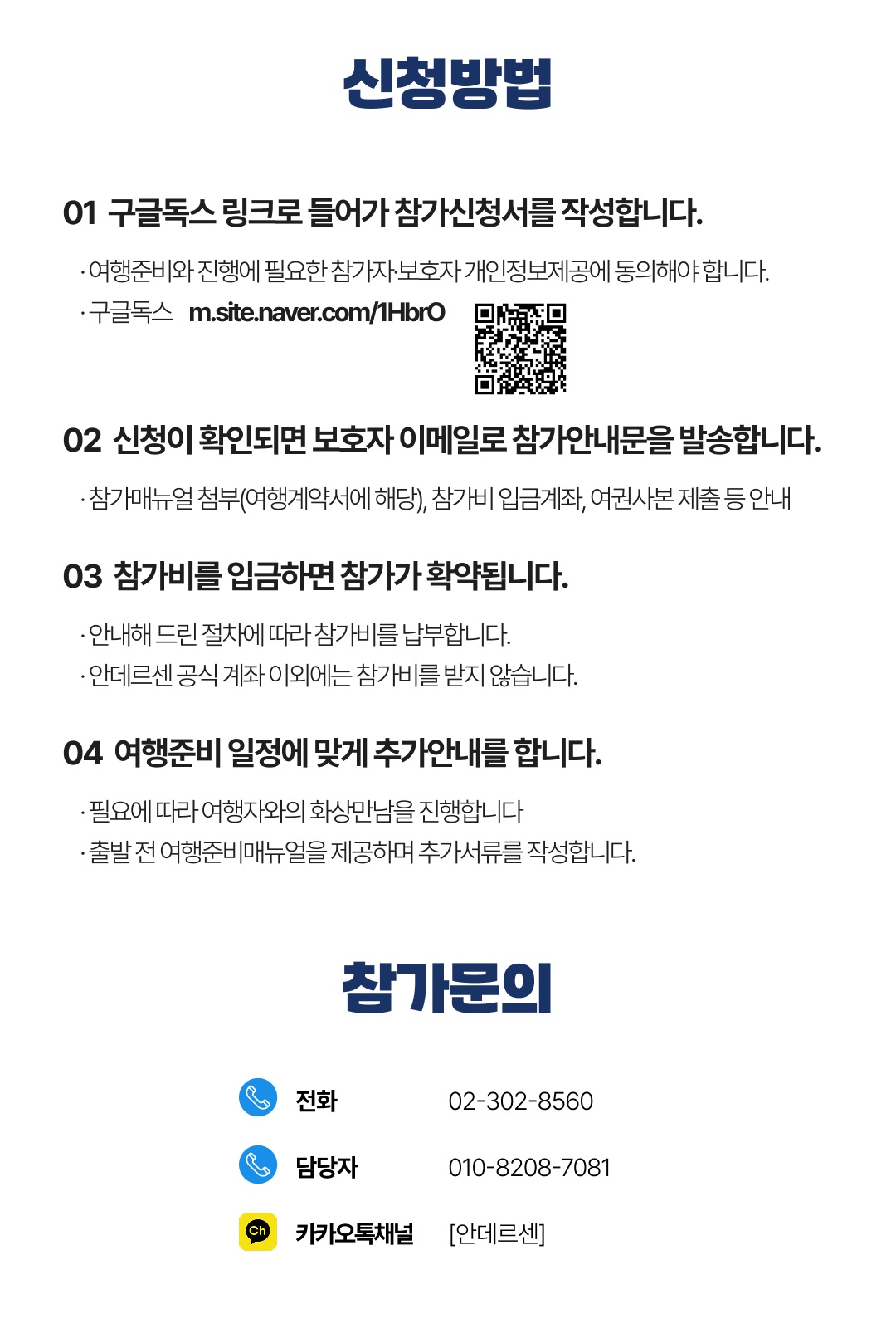 상세한 여행준비를 위해 구글 참가신청서를 작성해주셔야 합니다. 구글독스 참가신청서를 작성하지 않으면 정상적으로 예약이 접수되지 않습니다. 클릭하면 바로 구글 참가신청서로 연결됩니다.