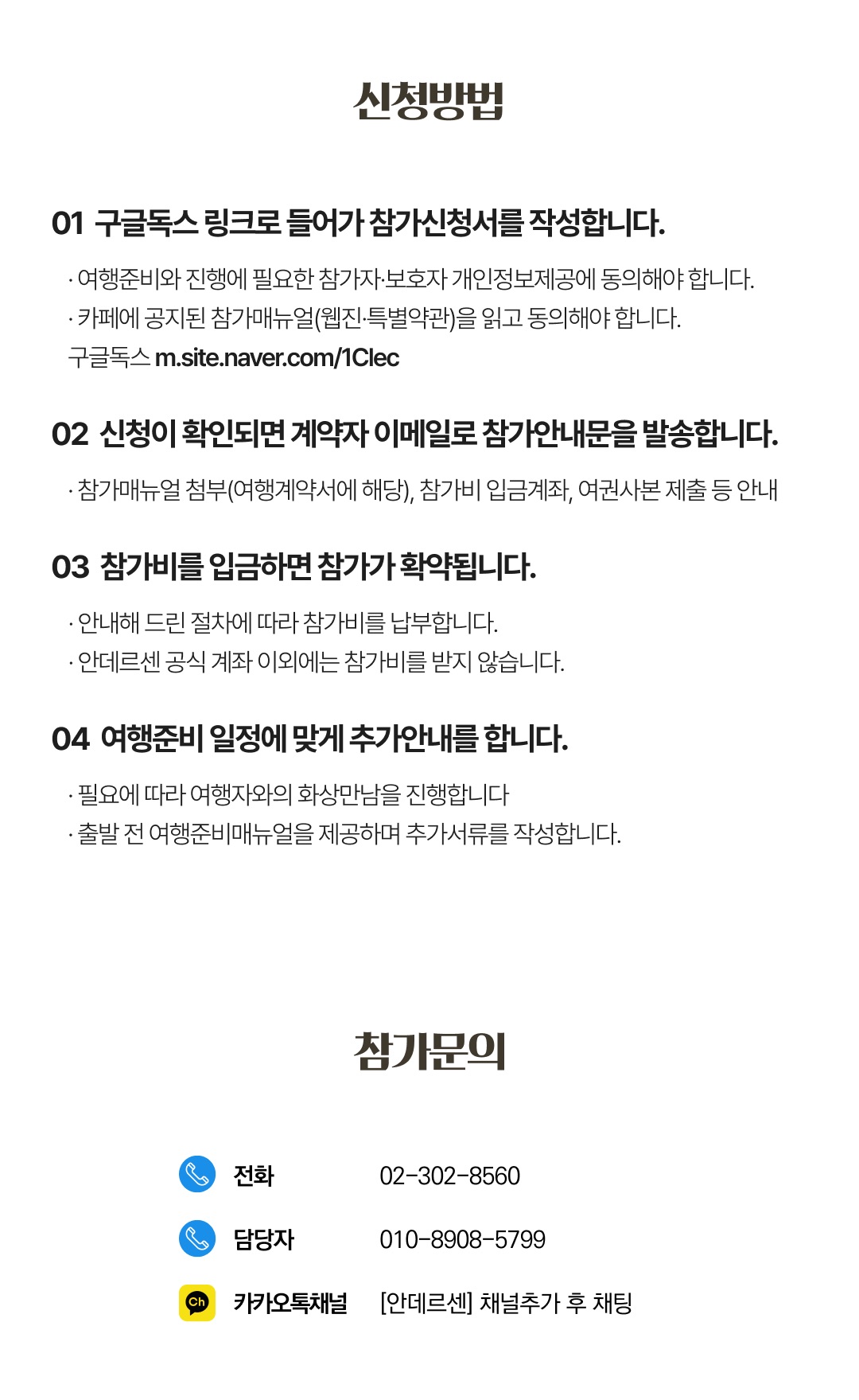 상세한 여행준비를 위해 구글 참가신청서를 작성해주셔야 합니다. 구글독스 참가신청서를 작성하지 않으면 정상적으로 예약이 접수되지 않습니다. 클릭하면 바로 구글 참가신청서로 연결됩니다.