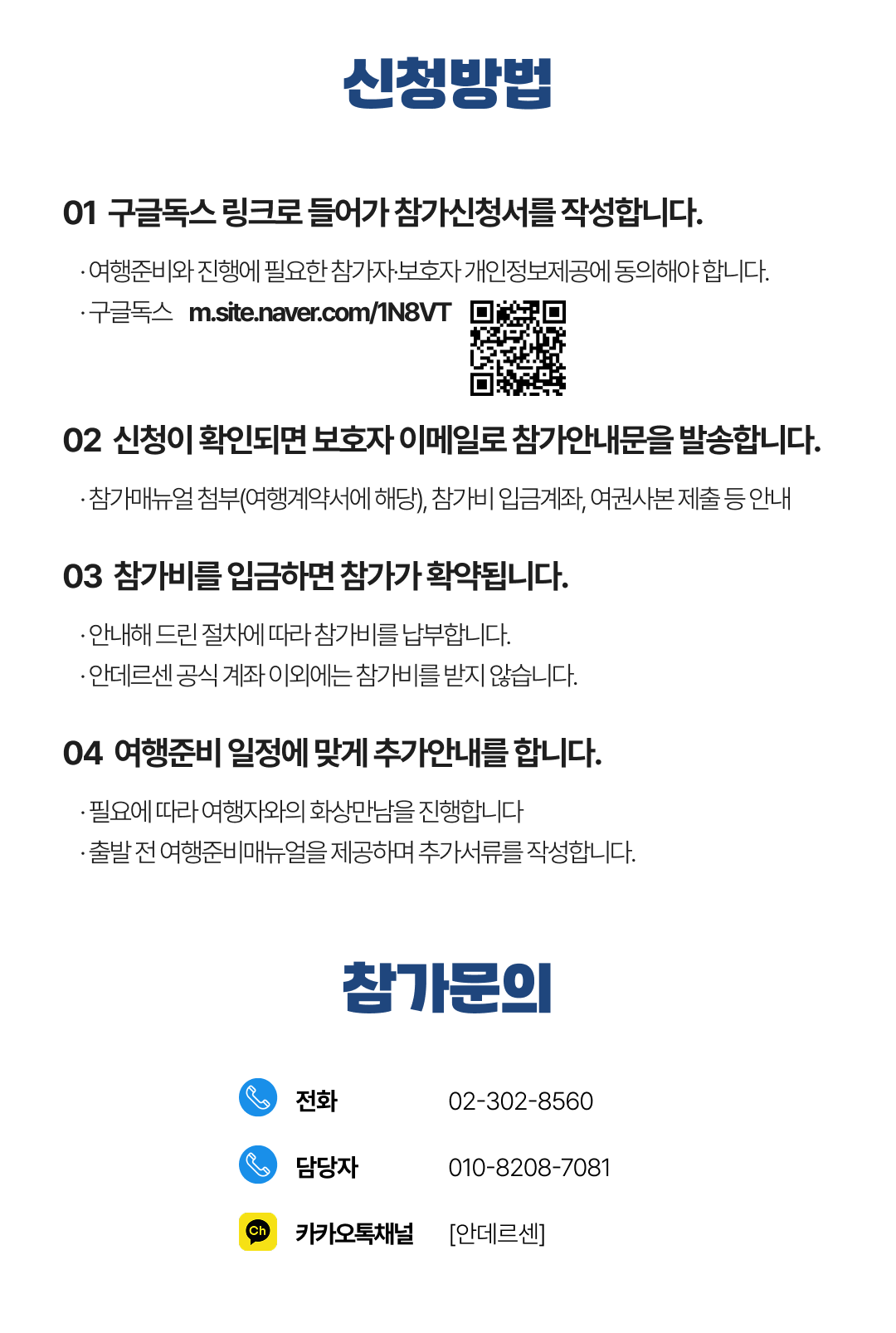 상세한 여행준비를 위해 구글 참가신청서를 작성해주셔야 합니다. 구글독스 참가신청서를 작성하지 않으면 정상적으로 예약이 접수되지 않습니다. 클릭하면 바로 구글 참가신청서로 연결됩니다.