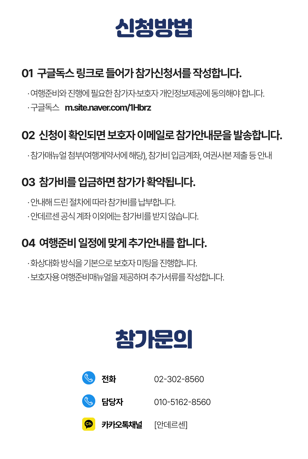 상세한 여행준비를 위해 구글 참가신청서를 작성해주셔야 합니다. 구글독스 참가신청서를 작성하지 않으면 정상적으로 예약이 접수되지 않습니다. 클릭하면 바로 구글 참가신청서로 연결됩니다.