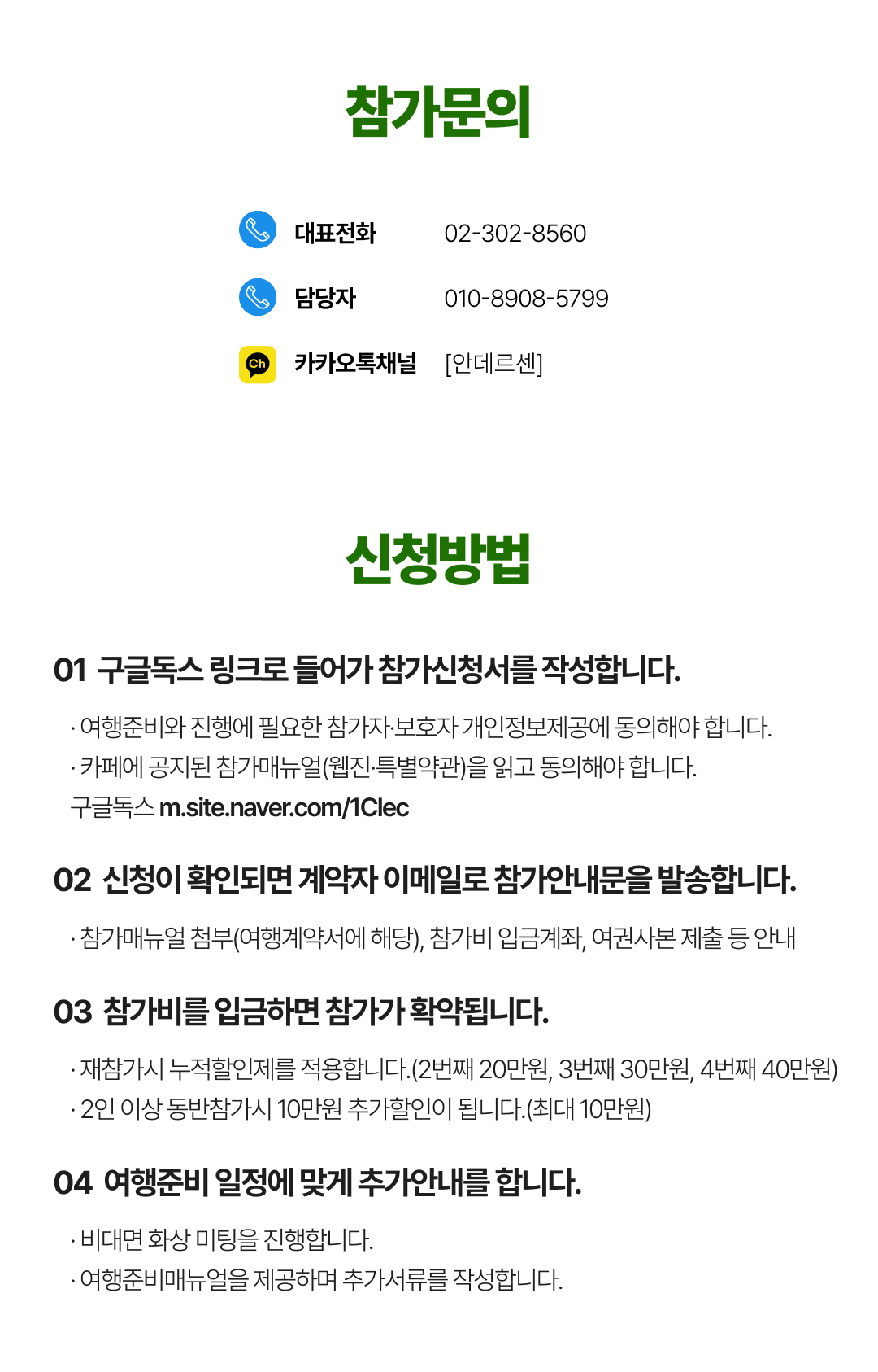 상세한 여행준비를 위해 구글 참가신청서를 작성해주셔야 합니다. 구글독스 참가신청서를 작성하지 않으면 정상적으로 예약이 접수되지 않습니다. 클릭하면 바로 구글 참가신청서로 연결됩니다.