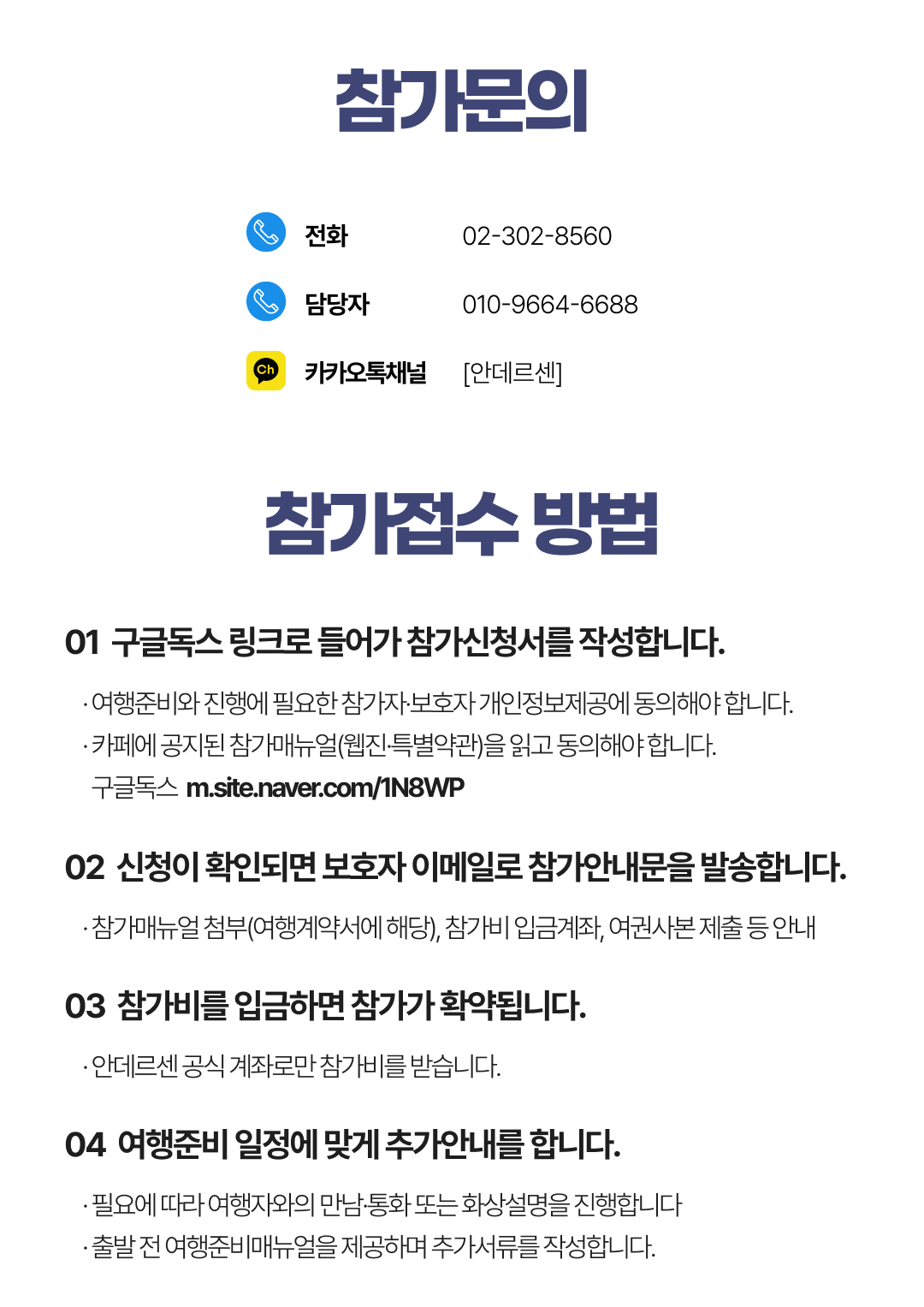 상세한 여행준비를 위해 구글 참가신청서를 작성해주셔야 합니다. 구글독스 참가신청서를 작성하지 않으면 정상적으로 예약이 접수되지 않습니다. 클릭하면 바로 구글 참가신청서로 연결됩니다.