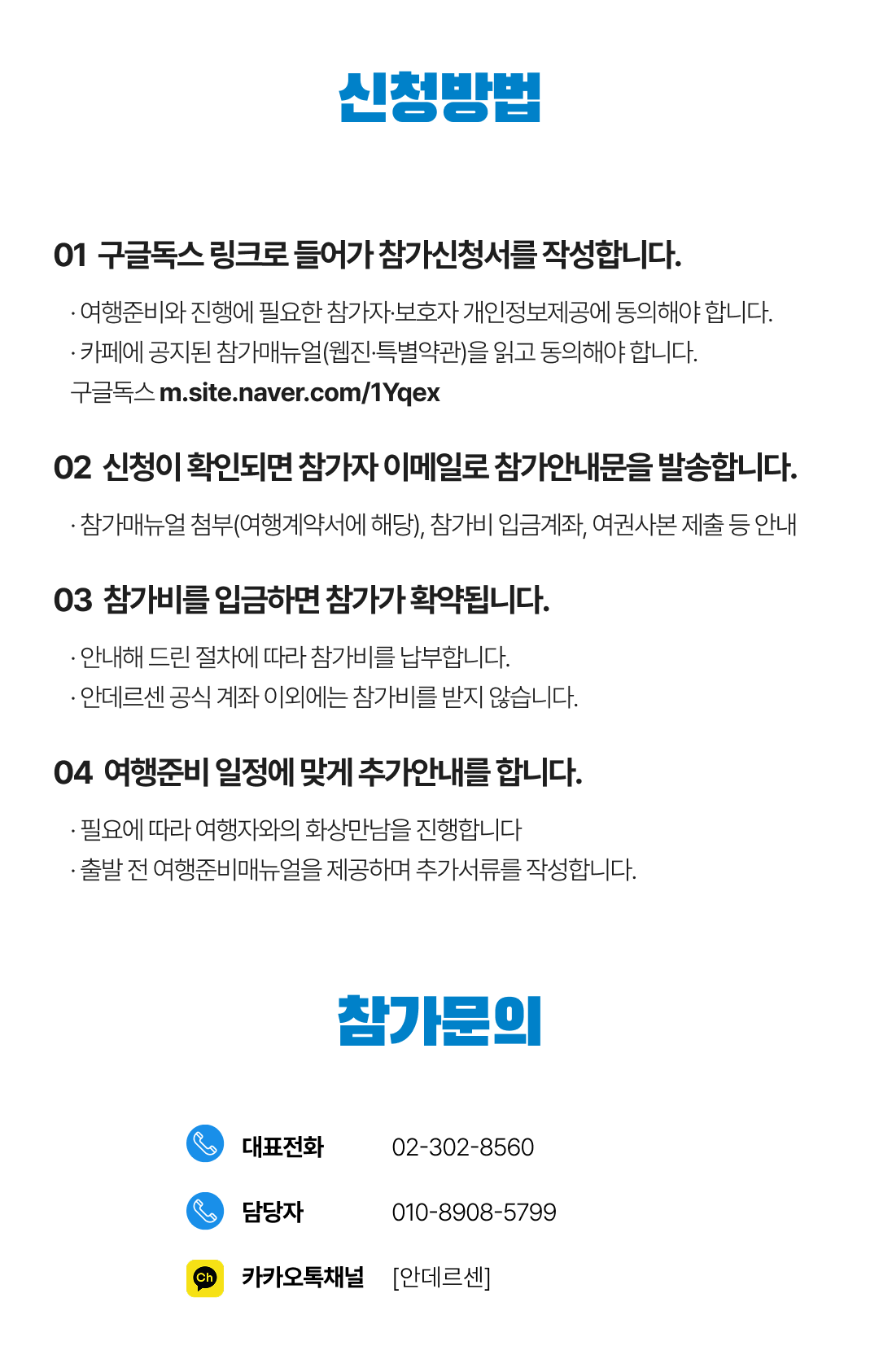 상세한 여행준비를 위해 구글 참가신청서를 작성해주셔야 합니다. 구글독스 참가신청서를 작성하지 않으면 정상적으로 예약이 접수되지 않습니다. 클릭하면 바로 구글 참가신청서로 연결됩니다.