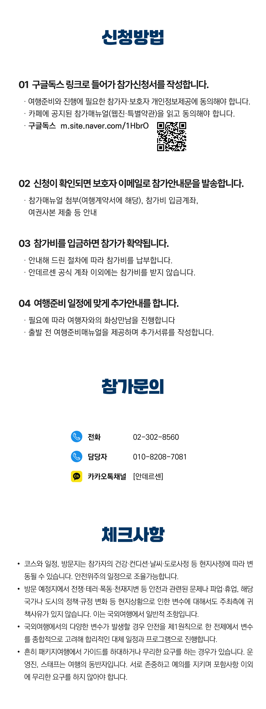 상세한 여행준비를 위해 구글 참가신청서를 작성해주셔야 합니다. 구글독스 참가신청서를 작성하지 않으면 정상적으로 예약이 접수되지 않습니다. 클릭하면 바로 구글 참가신청서로 연결됩니다.
