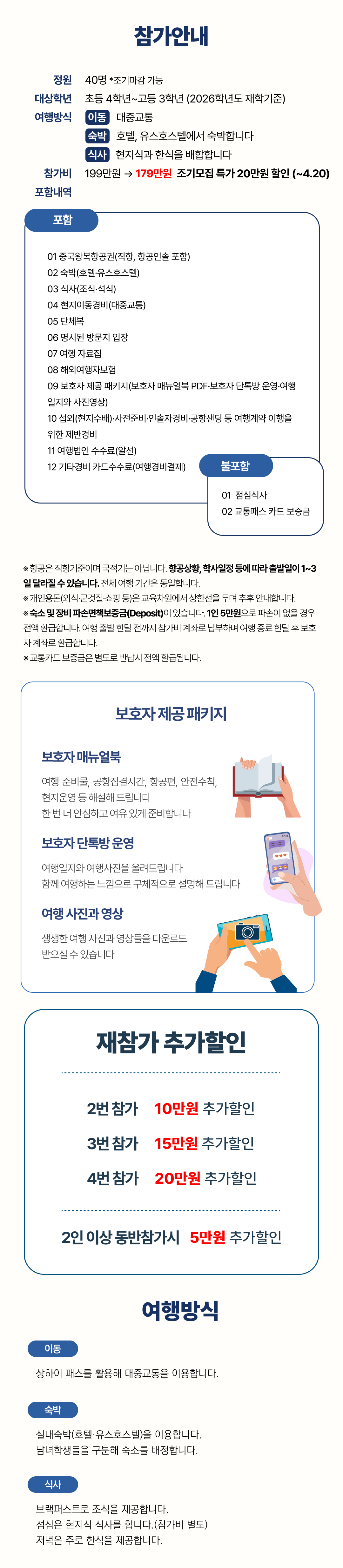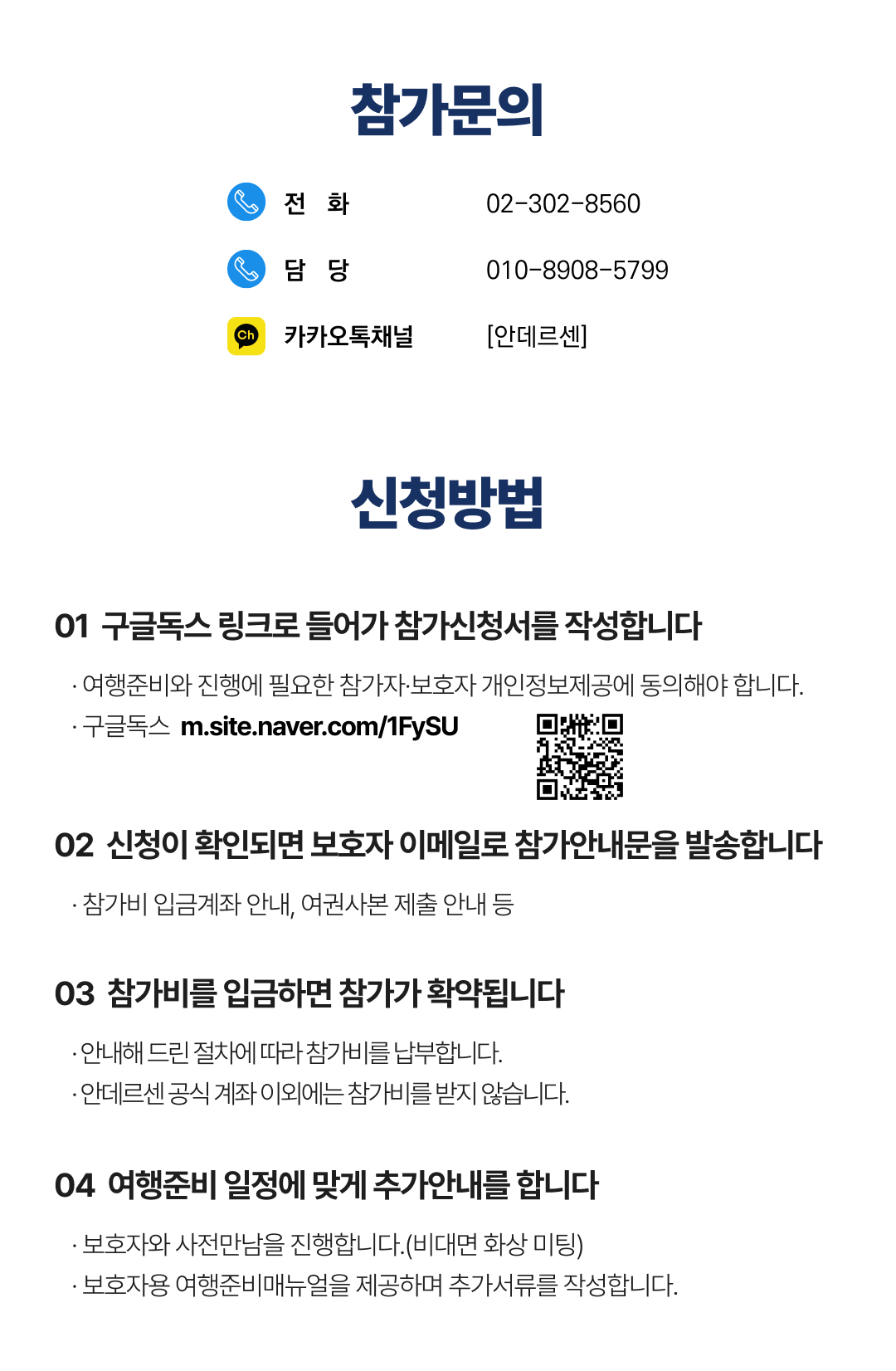 상세한 여행준비를 위해 구글 참가신청서를 작성해주셔야 합니다. 구글독스 참가신청서를 작성하지 않으면 정상적으로 예약이 접수되지 않습니다. 클릭하면 바로 구글 참가신청서로 연결됩니다.