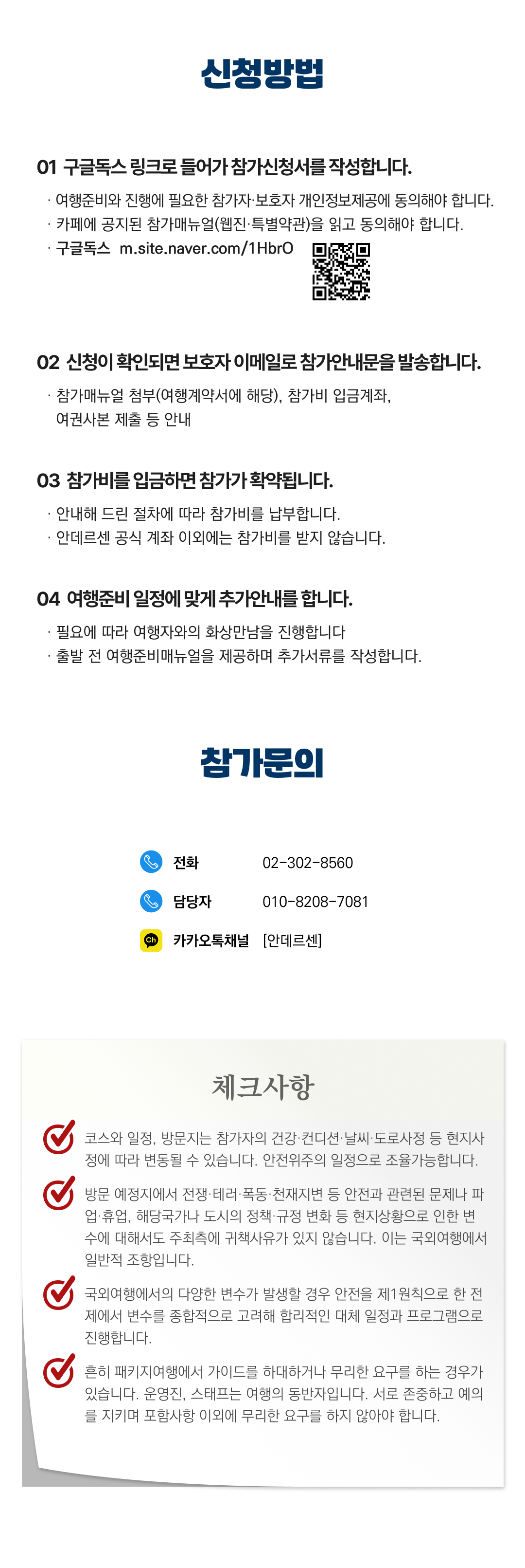 상세한 여행준비를 위해 구글 참가신청서를 작성해주셔야 합니다. 구글독스 참가신청서를 작성하지 않으면 정상적으로 예약이 접수되지 않습니다. 클릭하면 바로 구글 참가신청서로 연결됩니다.
