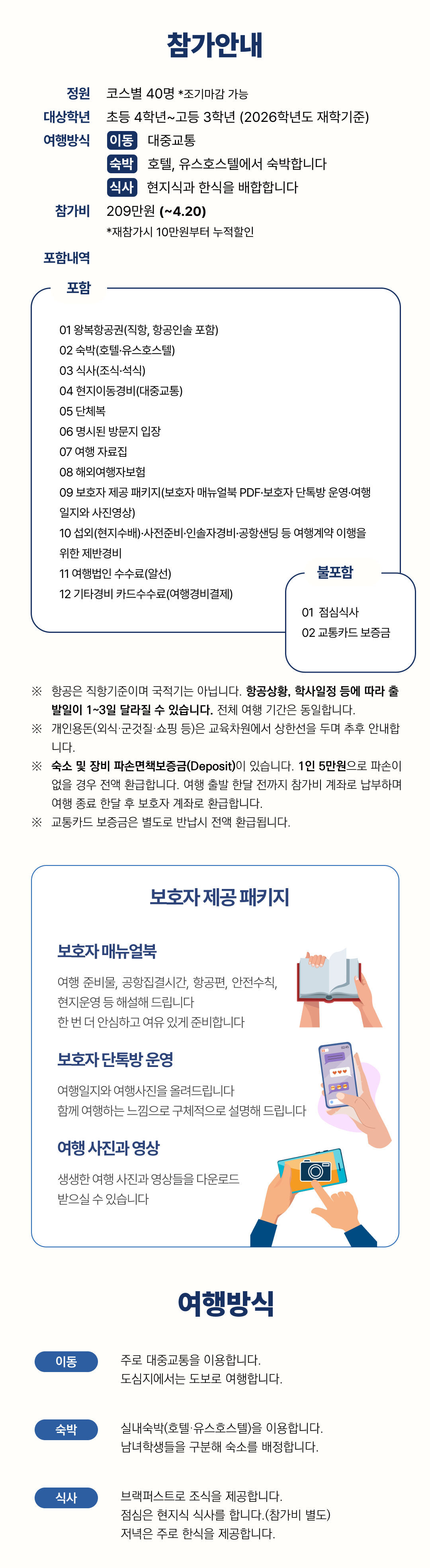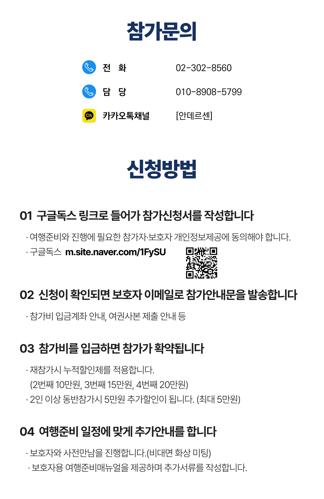 상세한 여행준비를 위해 구글 참가신청서를 작성해주셔야 합니다. 구글독스 참가신청서를 작성하지 않으면 정상적으로 예약이 접수되지 않습니다. 클릭하면 바로 구글 참가신청서로 연결됩니다.