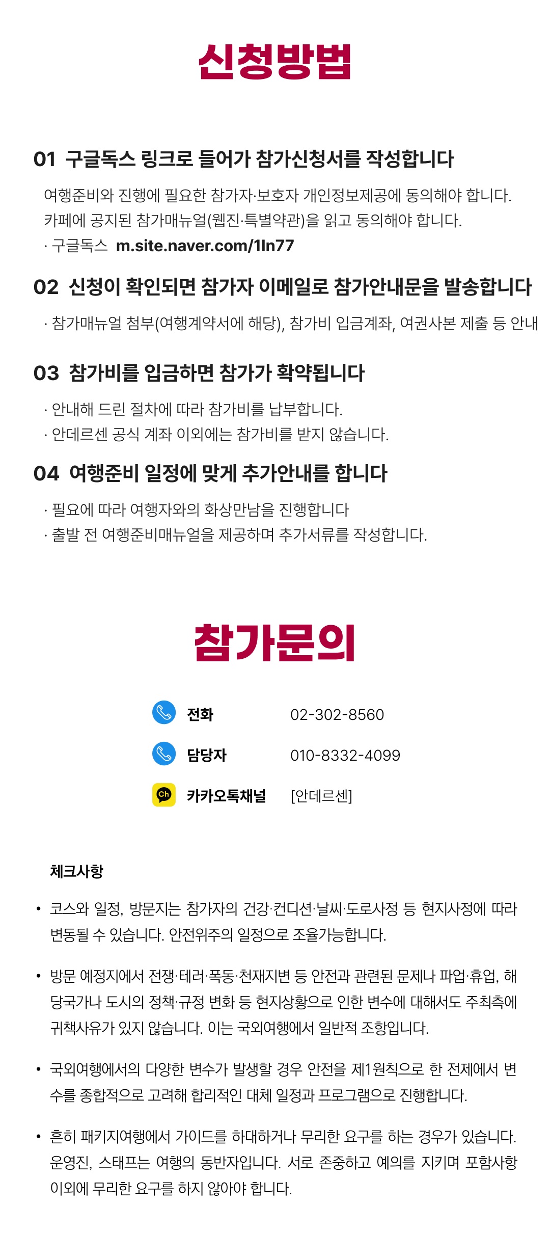 상세한 여행준비를 위해 구글 참가신청서를 작성해주셔야 합니다. 구글독스 참가신청서를 작성하지 않으면 정상적으로 예약이 접수되지 않습니다. 클릭하면 바로 구글 참가신청서로 연결됩니다.
