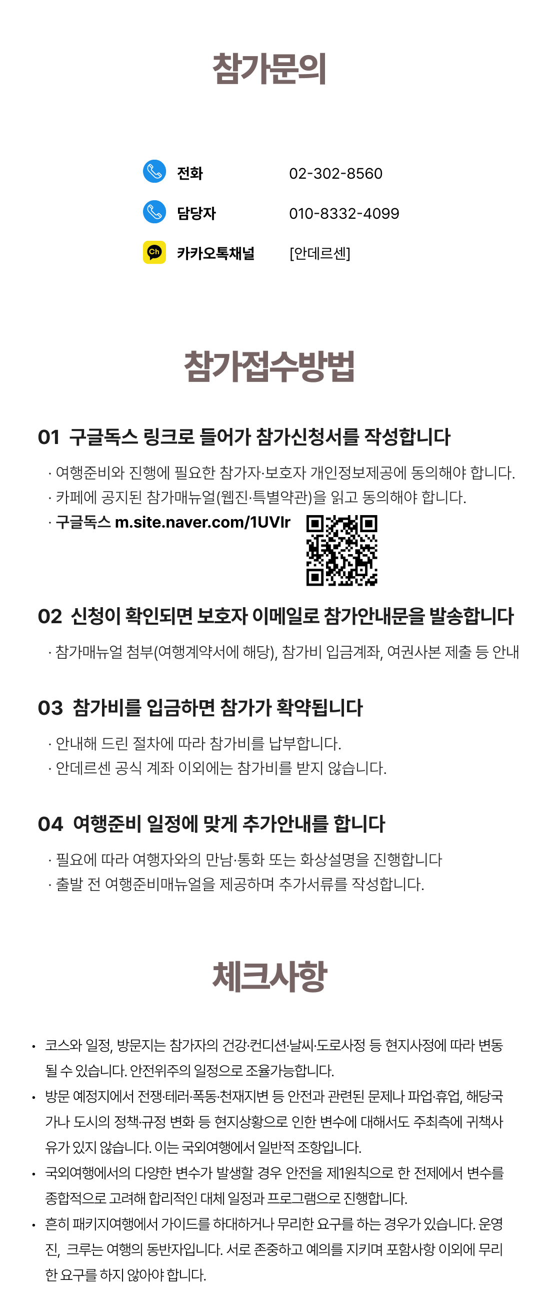 상세한 여행준비를 위해 구글 참가신청서를 작성해주셔야 합니다. 구글독스 참가신청서를 작성하지 않으면 정상적으로 예약이 접수되지 않습니다. 클릭하면 바로 구글 참가신청서로 연결됩니다.