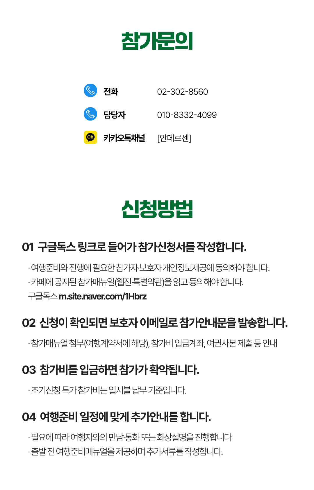 상세한 여행준비를 위해 구글 참가신청서를 작성해주셔야 합니다. 구글독스 참가신청서를 작성하지 않으면 정상적으로 예약이 접수되지 않습니다. 클릭하면 바로 구글 참가신청서로 연결됩니다.