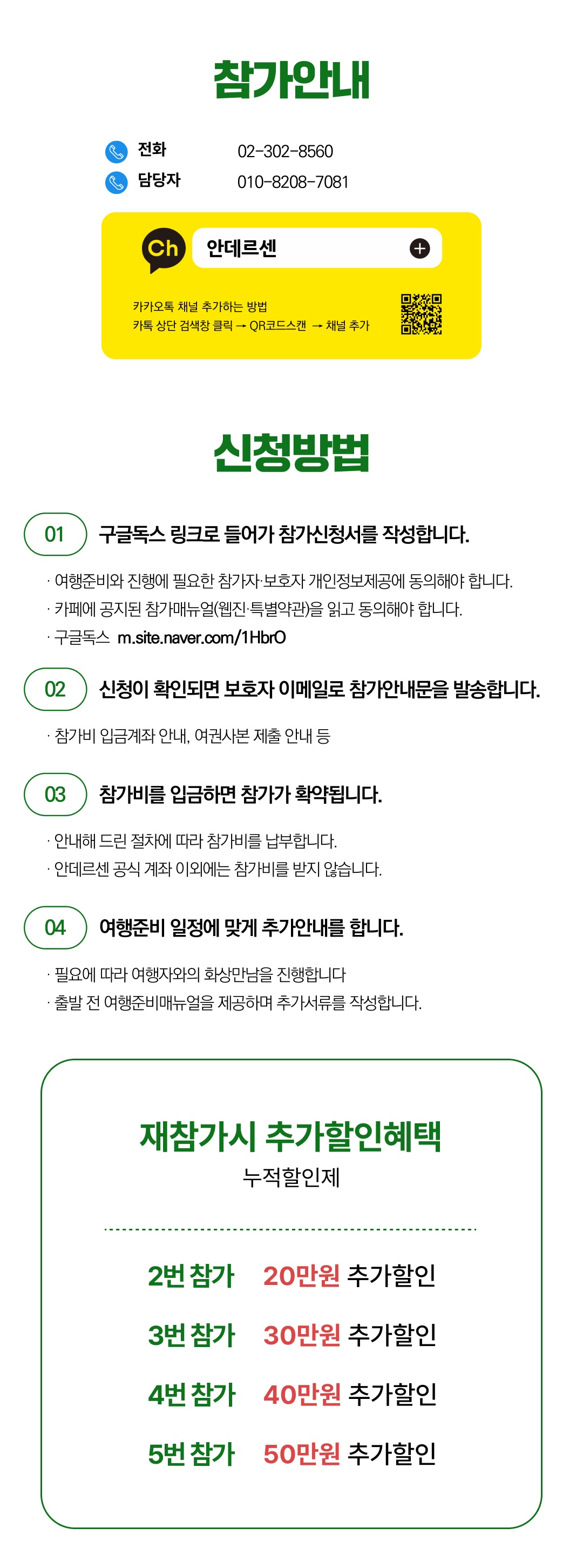 상세한 여행준비를 위해 구글 참가신청서를 작성해주셔야 합니다. 구글독스 참가신청서를 작성하지 않으면 정상적으로 예약이 접수되지 않습니다. 클릭하면 바로 구글 참가신청서로 연결됩니다.
