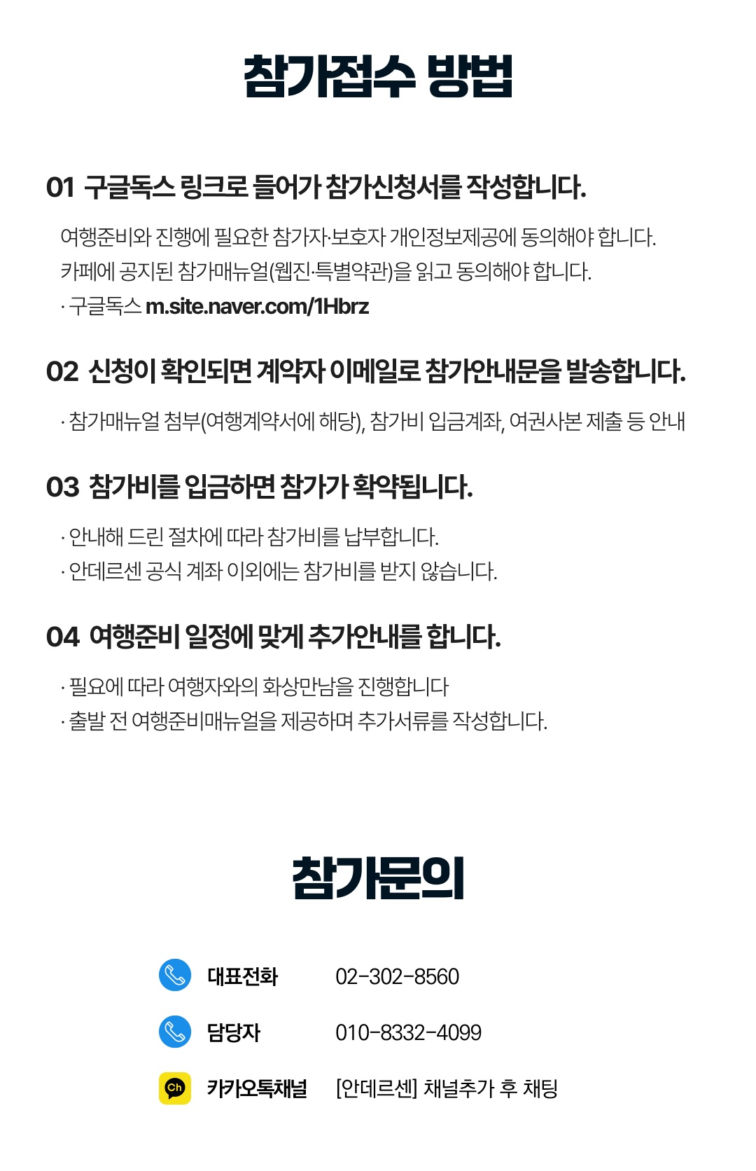 상세한 여행준비를 위해 구글 참가신청서를 작성해주셔야 합니다. 구글독스 참가신청서를 작성하지 않으면 정상적으로 예약이 접수되지 않습니다. 클릭하면 바로 구글 참가신청서로 연결됩니다.