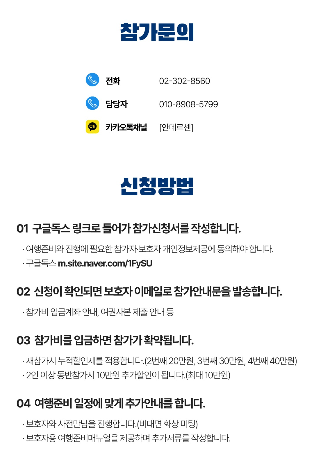 상세한 여행준비를 위해 구글 참가신청서를 작성해주셔야 합니다. 구글독스 참가신청서를 작성하지 않으면 정상적으로 예약이 접수되지 않습니다. 클릭하면 바로 구글 참가신청서로 연결됩니다.