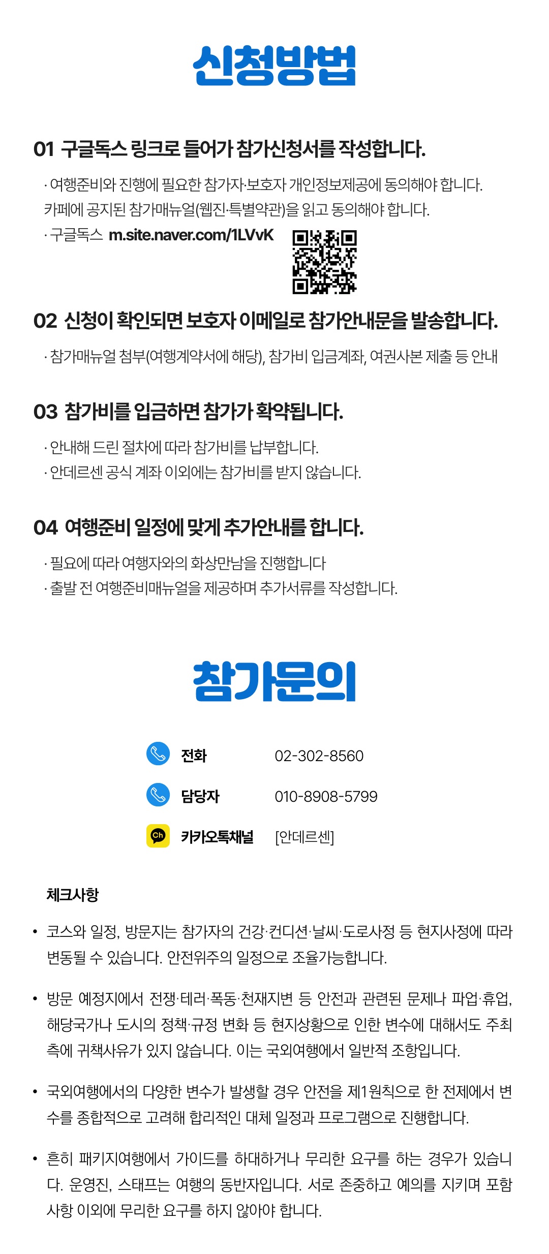 상세한 여행준비를 위해 구글 참가신청서를 작성해주셔야 합니다. 구글독스 참가신청서를 작성하지 않으면 정상적으로 예약이 접수되지 않습니다. 클릭하면 바로 구글 참가신청서로 연결됩니다.