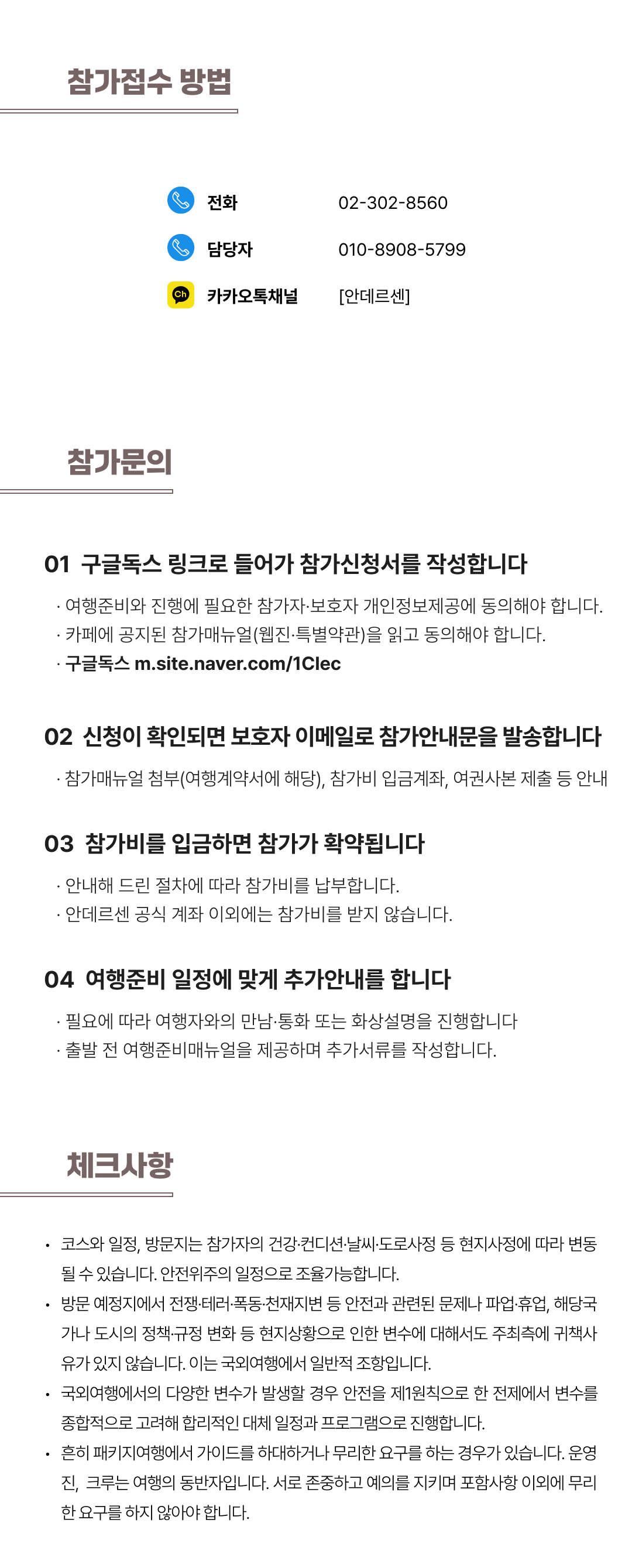 상세한 여행준비를 위해 구글 참가신청서를 작성해주셔야 합니다. 구글독스 참가신청서를 작성하지 않으면 정상적으로 예약이 접수되지 않습니다. 클릭하면 바로 구글 참가신청서로 연결됩니다.