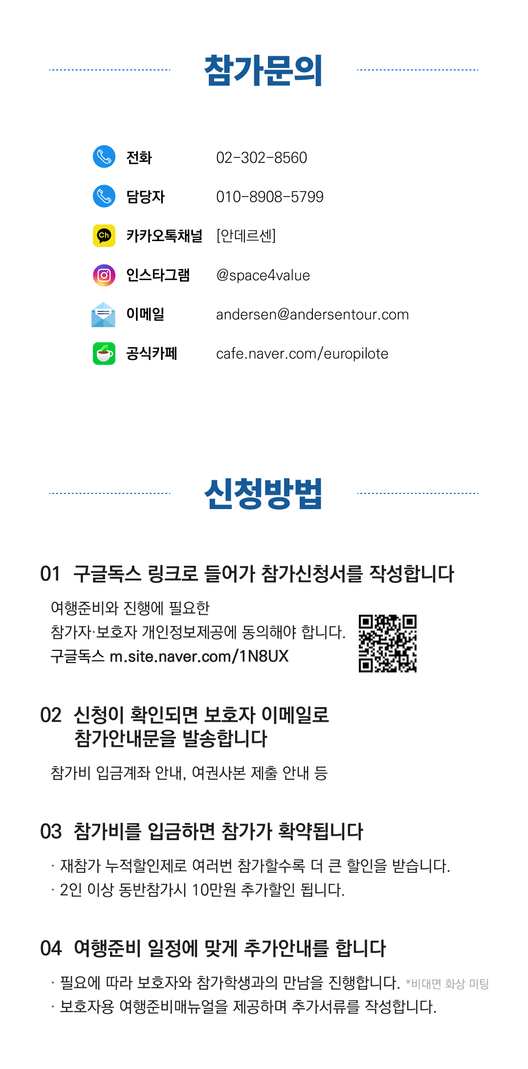 상세한 여행준비를 위해 구글 참가신청서를 작성해주셔야 합니다. 구글독스 참가신청서를 작성하지 않으면 정상적으로 예약이 접수되지 않습니다. 클릭하면 바로 구글 참가신청서로 연결됩니다.