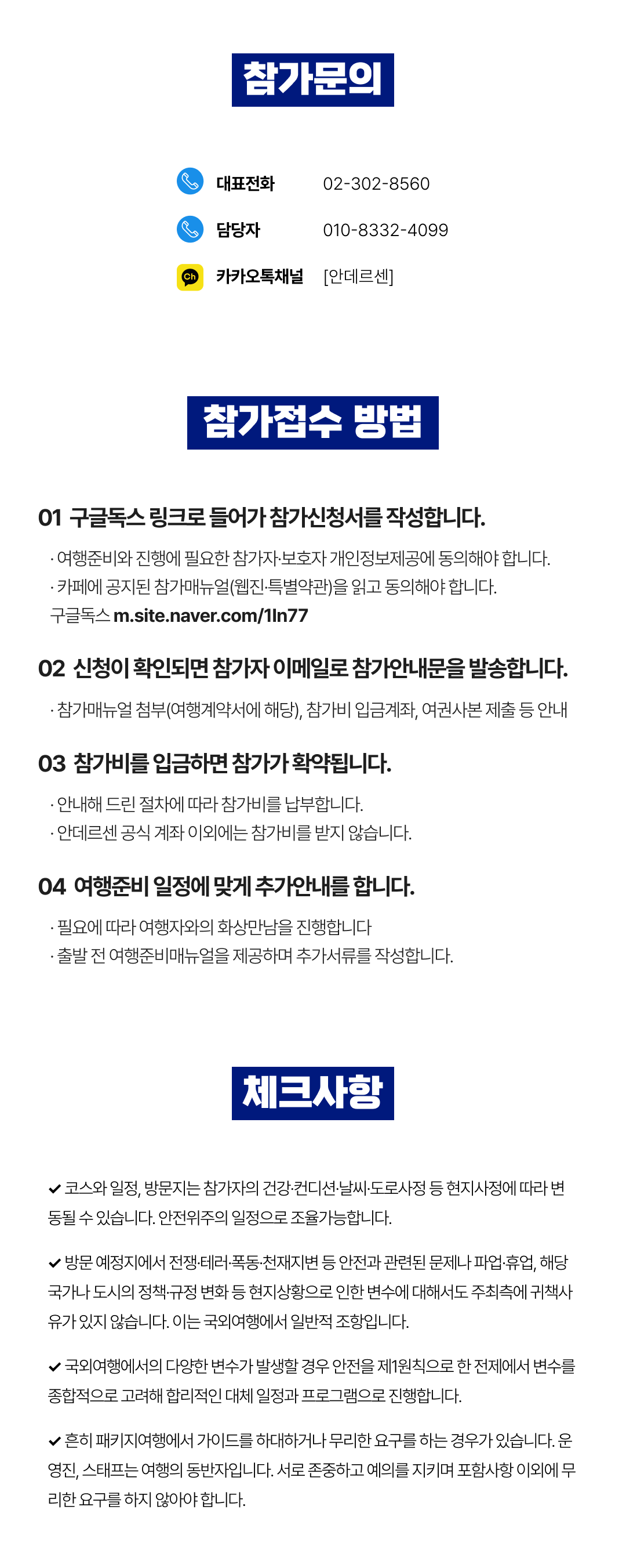 상세한 여행준비를 위해 구글 참가신청서를 작성해주셔야 합니다. 구글독스 참가신청서를 작성하지 않으면 정상적으로 예약이 접수되지 않습니다. 클릭하면 바로 구글 참가신청서로 연결됩니다.