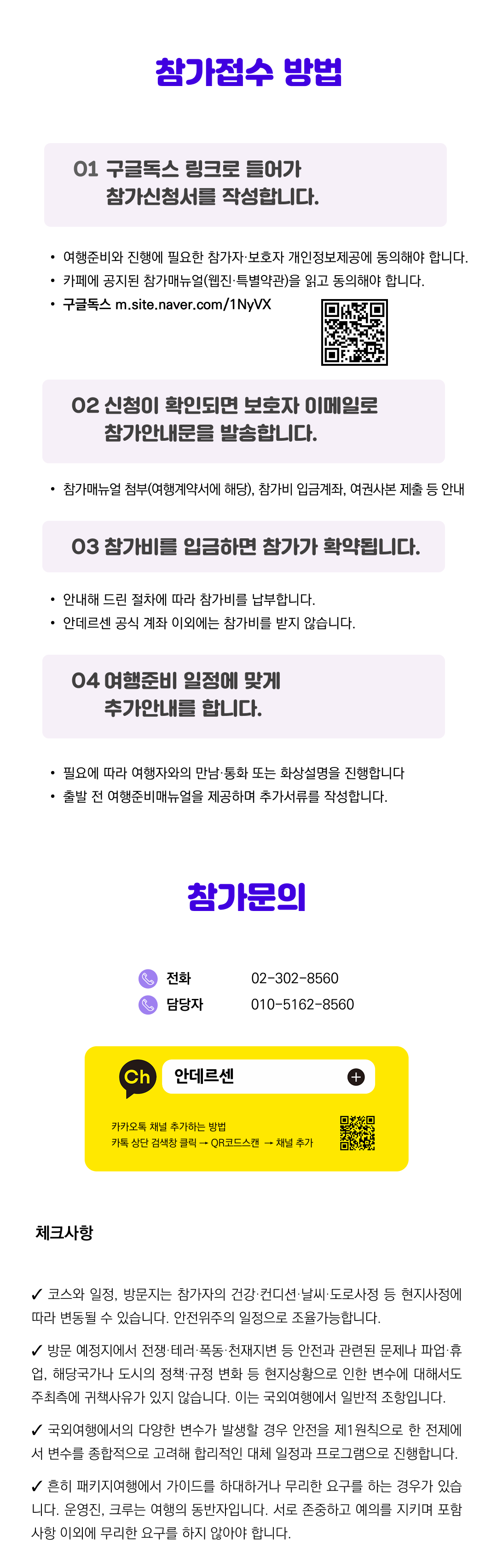 상세한 여행준비를 위해 구글 참가신청서를 작성해주셔야 합니다. 구글독스 참가신청서를 작성하지 않으면 정상적으로 예약이 접수되지 않습니다. 클릭하면 바로 구글 참가신청서로 연결됩니다.