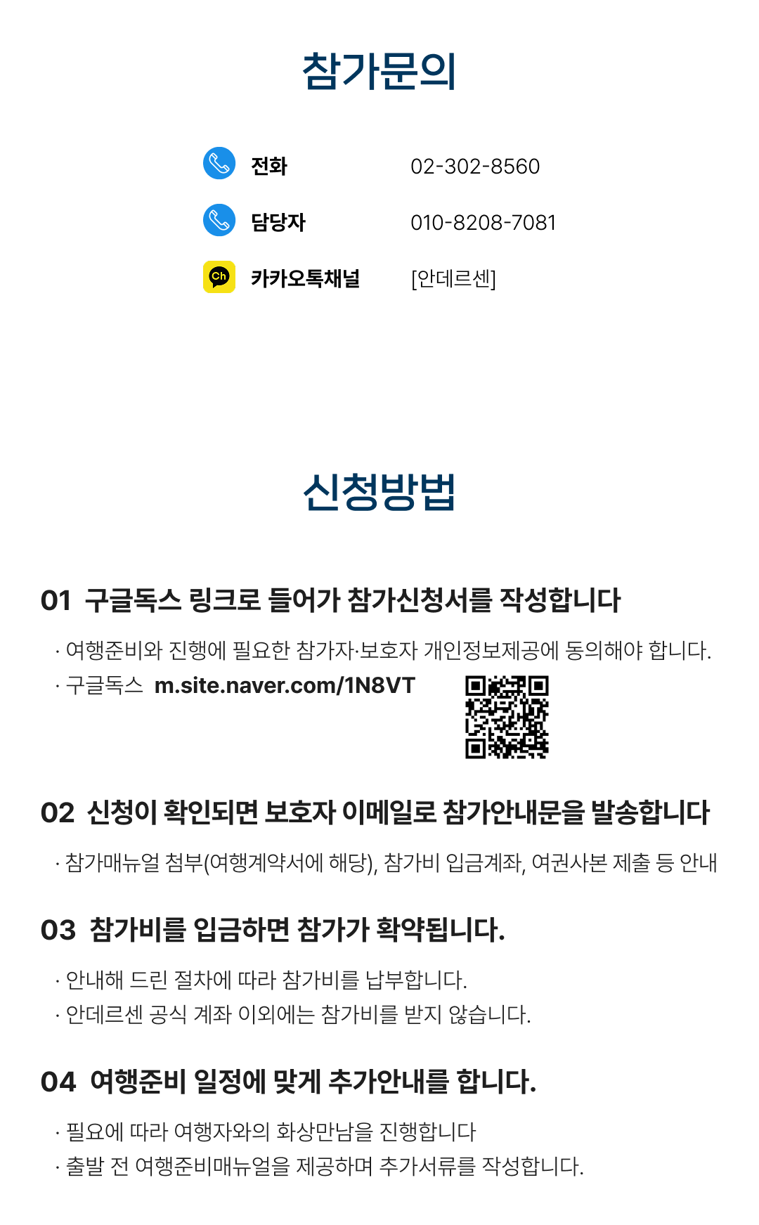 상세한 여행준비를 위해 구글 참가신청서를 작성해주셔야 합니다. 구글독스 참가신청서를 작성하지 않으면 정상적으로 예약이 접수되지 않습니다. 클릭하면 바로 구글 참가신청서로 연결됩니다.