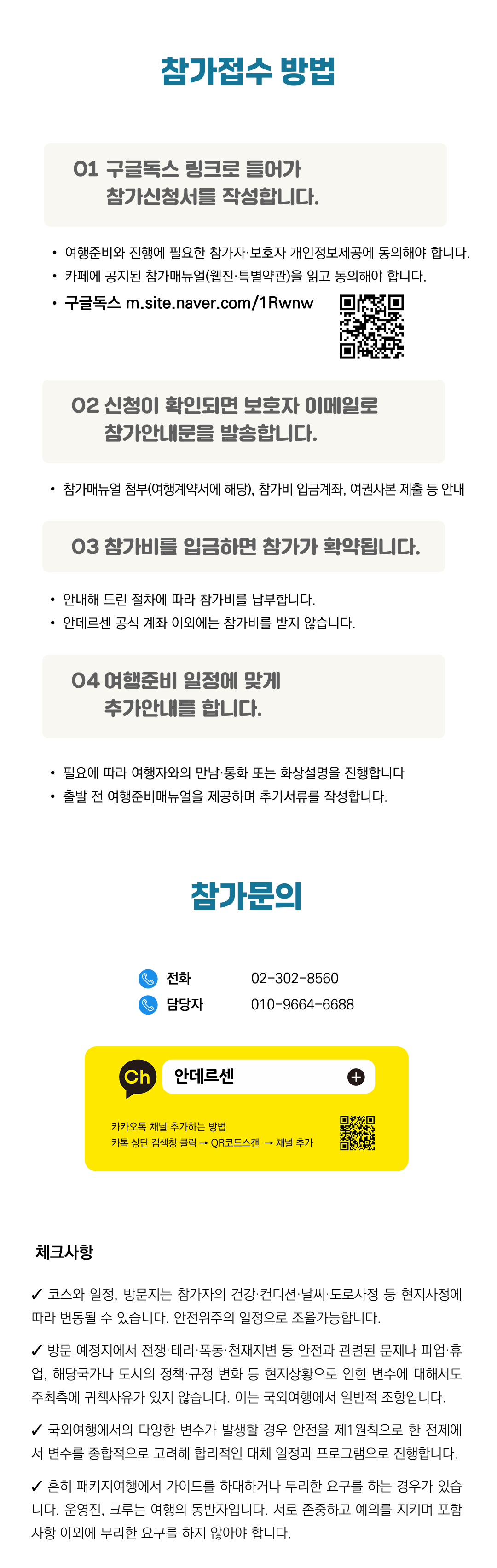 상세한 여행준비를 위해 구글 참가신청서를 작성해주셔야 합니다. 구글독스 참가신청서를 작성하지 않으면 정상적으로 예약이 접수되지 않습니다. 클릭하면 바로 구글 참가신청서로 연결됩니다.