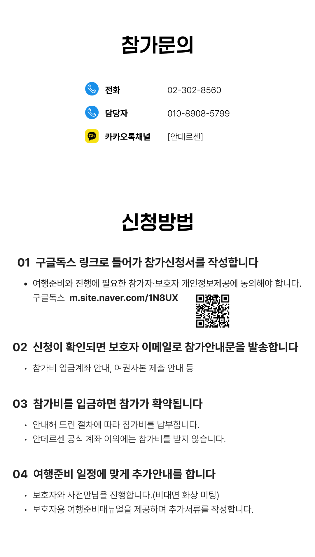상세한 여행준비를 위해 구글 참가신청서를 작성해주셔야 합니다. 구글독스 참가신청서를 작성하지 않으면 정상적으로 예약이 접수되지 않습니다. 클릭하면 바로 구글 참가신청서로 연결됩니다.