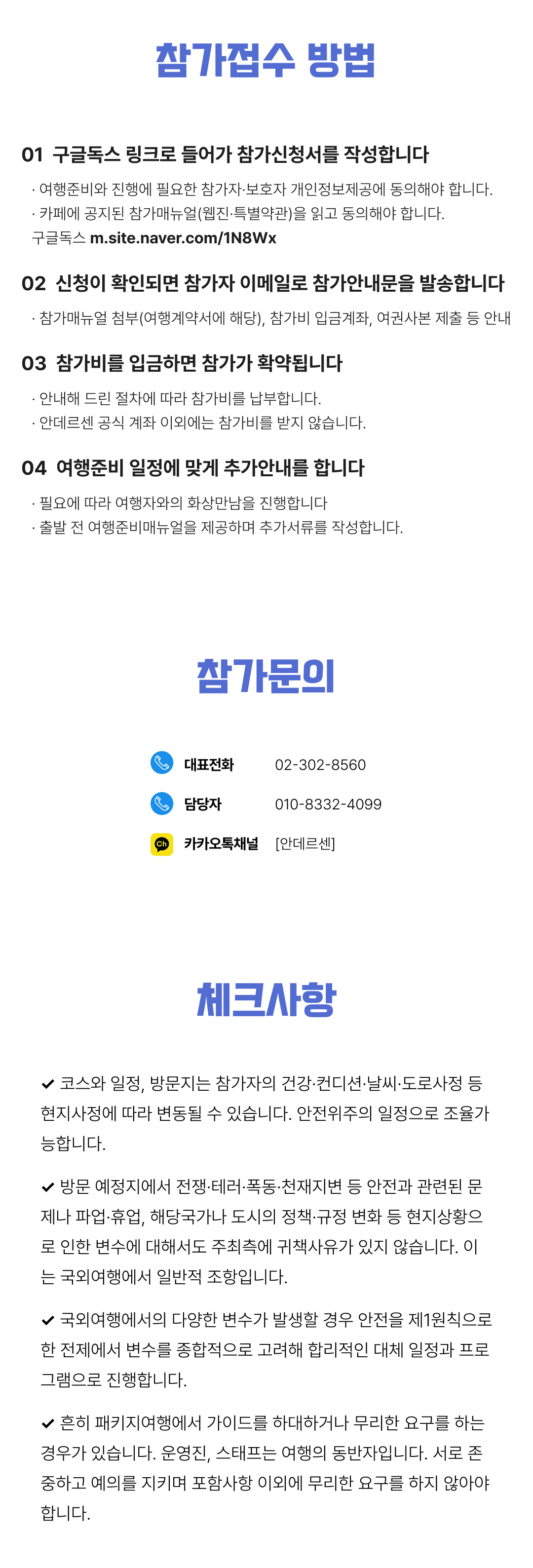 상세한 여행준비를 위해 구글 참가신청서를 작성해주셔야 합니다. 구글독스 참가신청서를 작성하지 않으면 정상적으로 예약이 접수되지 않습니다. 클릭하면 바로 구글 참가신청서로 연결됩니다.