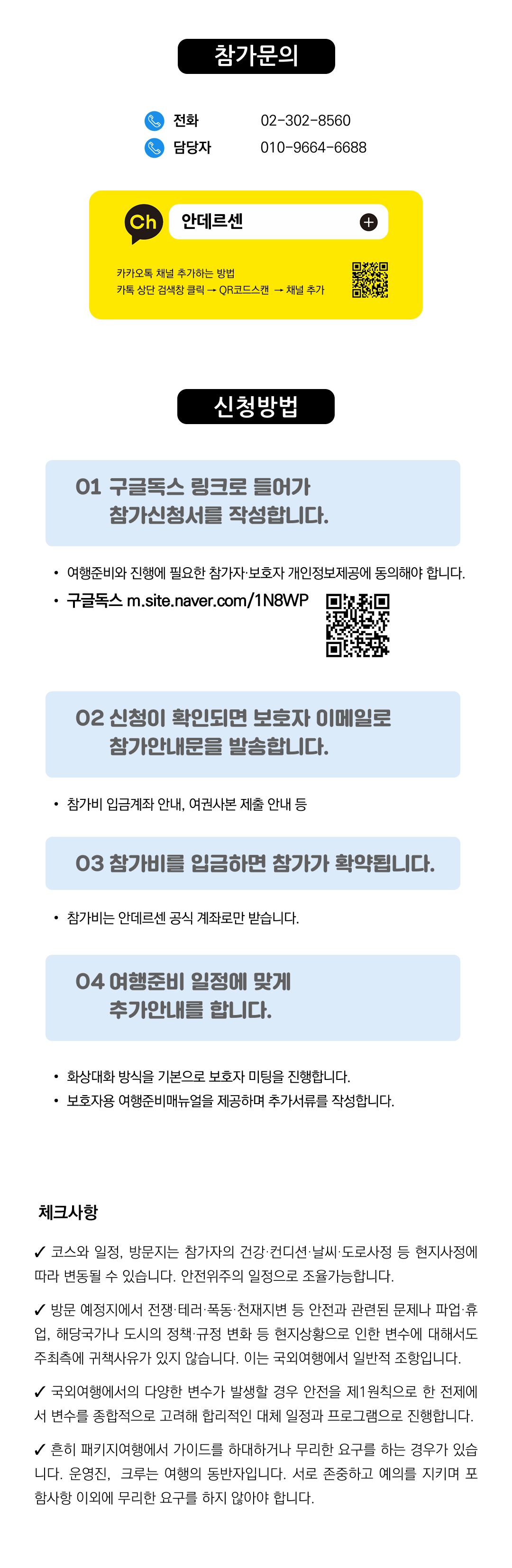 상세한 여행준비를 위해 구글 참가신청서를 작성해주셔야 합니다. 구글독스 참가신청서를 작성하지 않으면 정상적으로 예약이 접수되지 않습니다. 클릭하면 바로 구글 참가신청서로 연결됩니다.