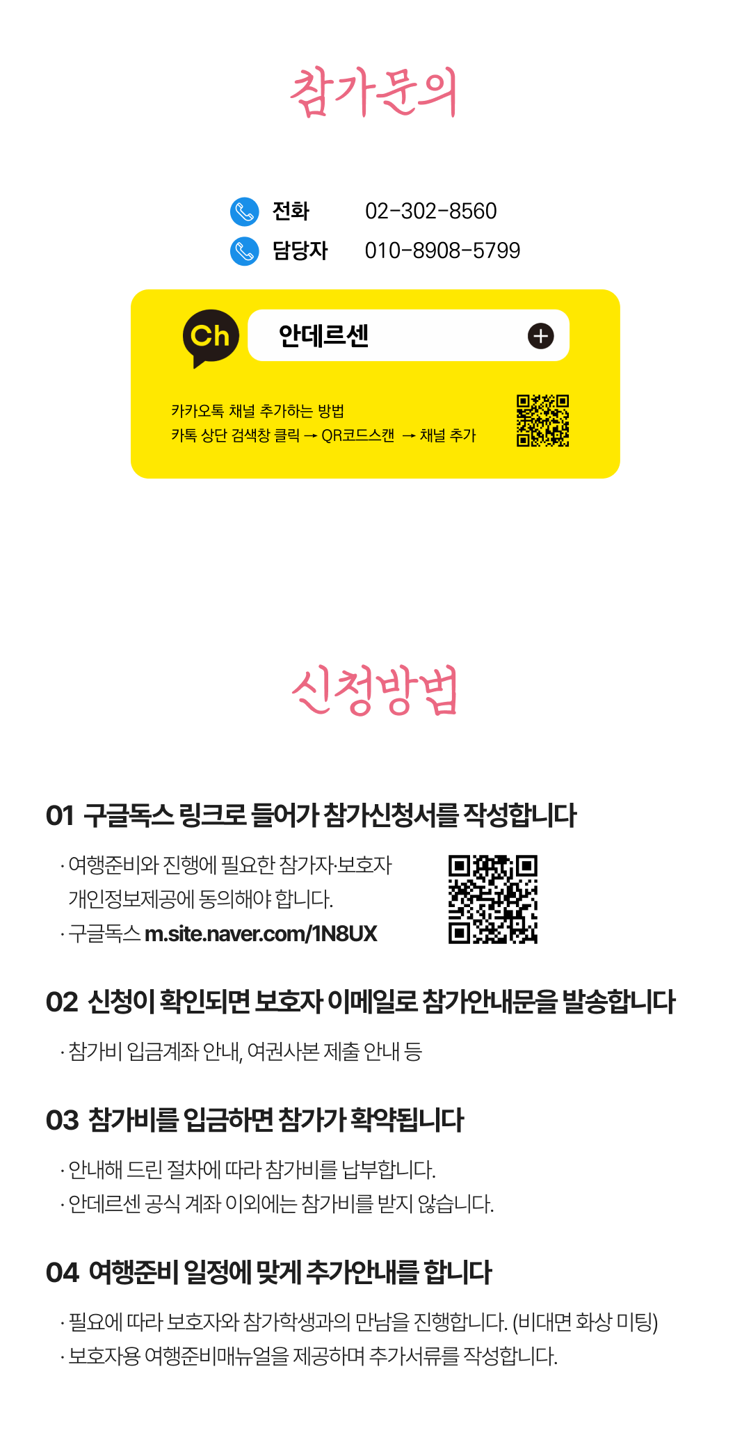 상세한 여행준비를 위해 구글 참가신청서를 작성해주셔야 합니다. 구글독스 참가신청서를 작성하지 않으면 정상적으로 예약이 접수되지 않습니다. 클릭하면 바로 구글 참가신청서로 연결됩니다.
