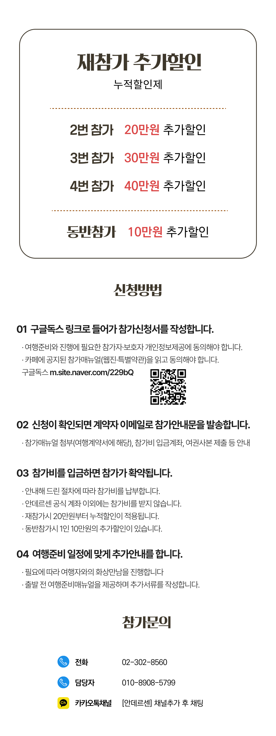 상세한 여행준비를 위해 구글 참가신청서를 작성해주셔야 합니다. 구글독스 참가신청서를 작성하지 않으면 정상적으로 예약이 접수되지 않습니다. 클릭하면 바로 구글 참가신청서로 연결됩니다.