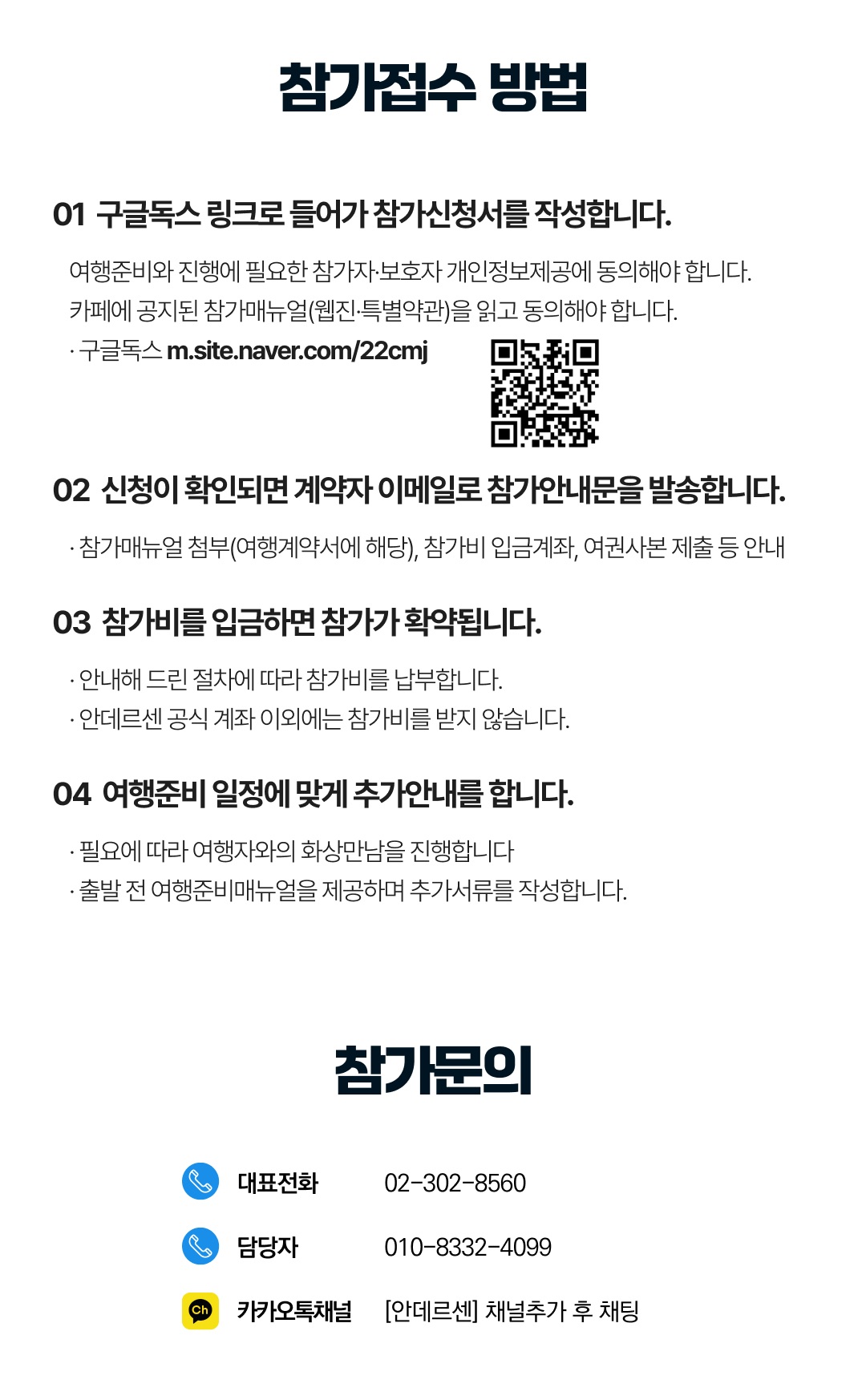 상세한 여행준비를 위해 구글 참가신청서를 작성해주셔야 합니다. 구글독스 참가신청서를 작성하지 않으면 정상적으로 예약이 접수되지 않습니다. 클릭하면 바로 구글 참가신청서로 연결됩니다.