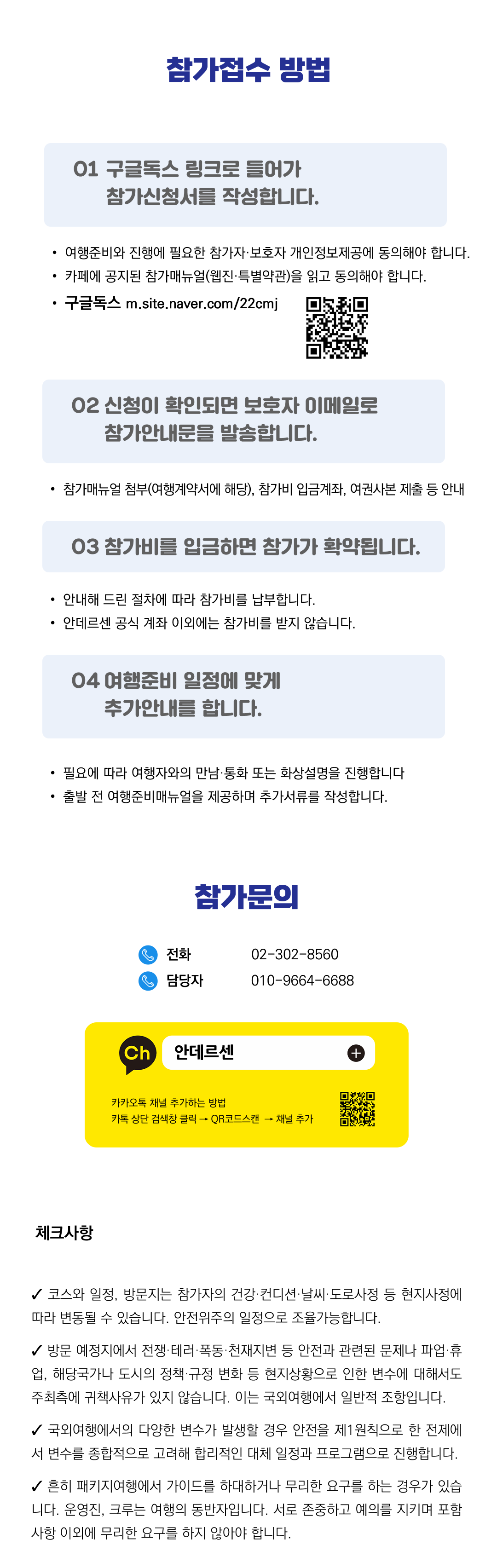 상세한 여행준비를 위해 구글 참가신청서를 작성해주셔야 합니다. 구글독스 참가신청서를 작성하지 않으면 정상적으로 예약이 접수되지 않습니다. 클릭하면 바로 구글 참가신청서로 연결됩니다.