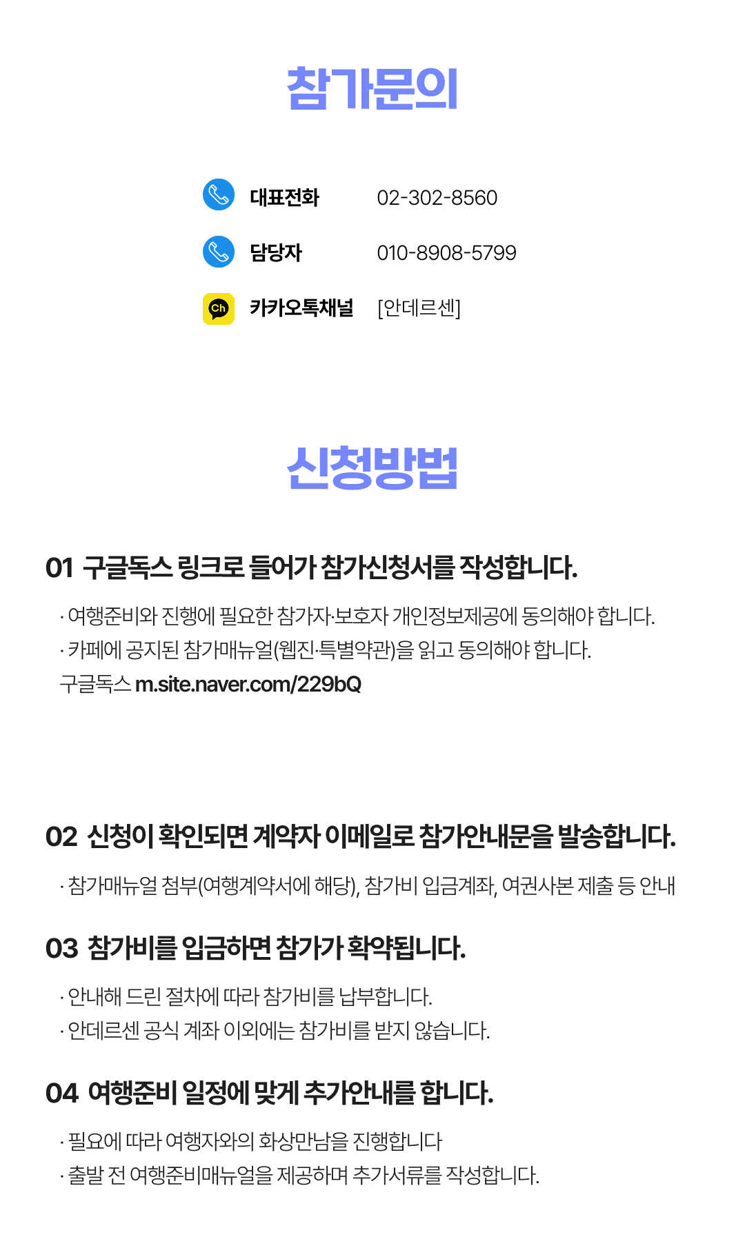상세한 여행준비를 위해 구글 참가신청서를 작성해주셔야 합니다. 구글독스 참가신청서를 작성하지 않으면 정상적으로 예약이 접수되지 않습니다. 클릭하면 바로 구글 참가신청서로 연결됩니다.