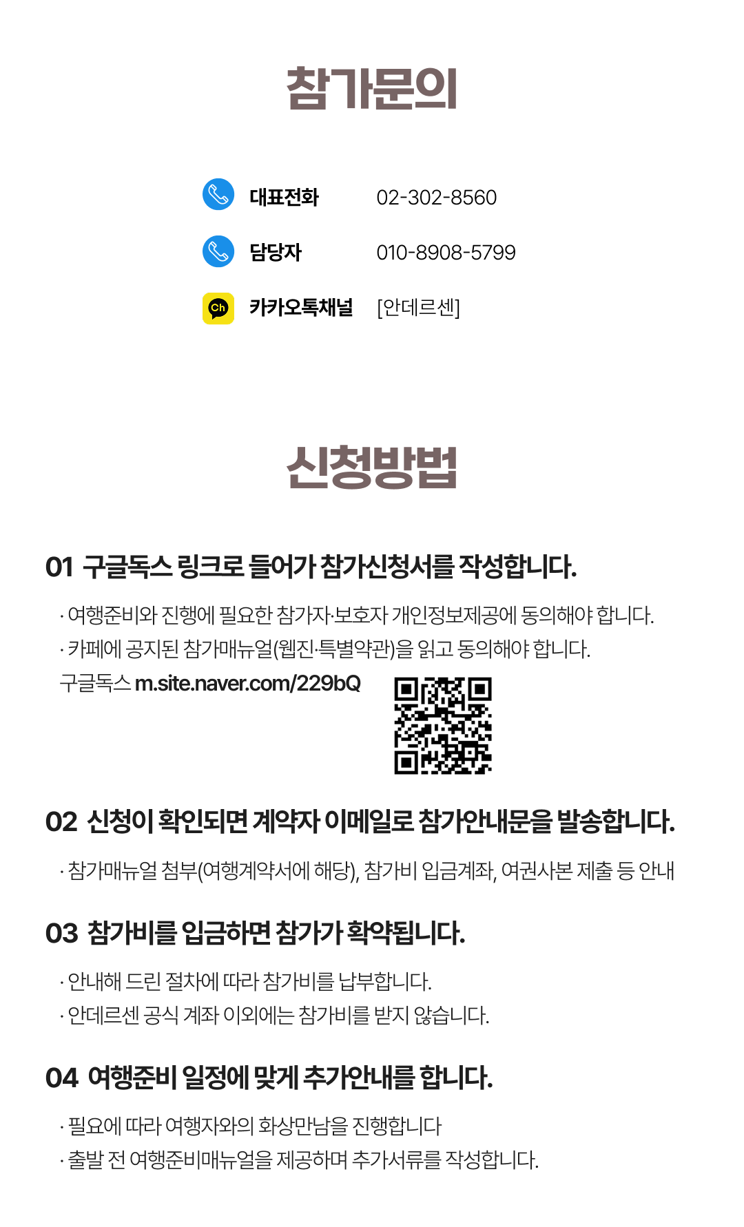 상세한 여행준비를 위해 구글 참가신청서를 작성해주셔야 합니다. 구글독스 참가신청서를 작성하지 않으면 정상적으로 예약이 접수되지 않습니다. 클릭하면 바로 구글 참가신청서로 연결됩니다.