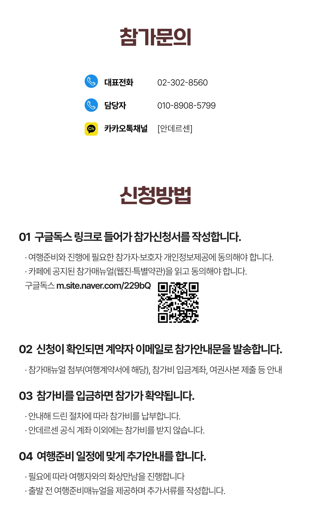 상세한 여행준비를 위해 구글 참가신청서를 작성해주셔야 합니다. 구글독스 참가신청서를 작성하지 않으면 정상적으로 예약이 접수되지 않습니다. 클릭하면 바로 구글 참가신청서로 연결됩니다.