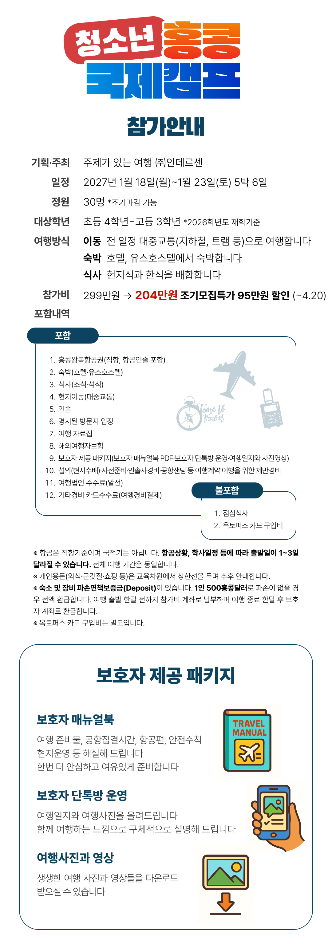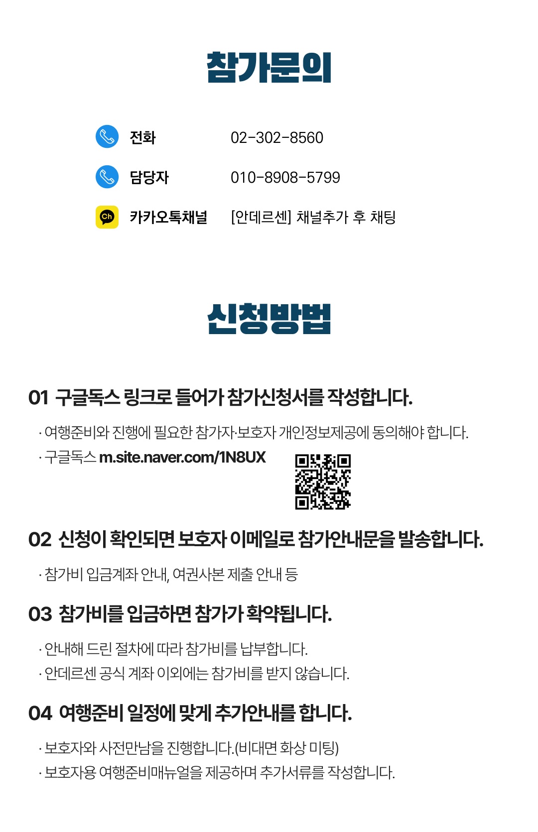 상세한 여행준비를 위해 구글 참가신청서를 작성해주셔야 합니다. 구글독스 참가신청서를 작성하지 않으면 정상적으로 예약이 접수되지 않습니다. 클릭하면 바로 구글 참가신청서로 연결됩니다.