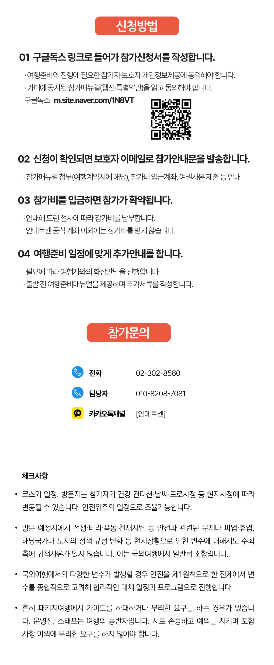 상세한 여행준비를 위해 구글 참가신청서를 작성해주셔야 합니다. 구글독스 참가신청서를 작성하지 않으면 정상적으로 예약이 접수되지 않습니다. 클릭하면 바로 구글 참가신청서로 연결됩니다.